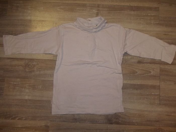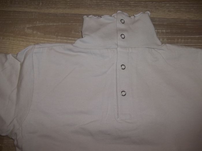 Tee-shirt à manches longues et col roulé (jersey finement côtelé de 7 cm à replier). 100 % coton, uni rose très clair (couleur un peu ternie). Bord col effet festonné, petites fronces bas du col, ouverture dos (11 cm en plus du col) fermée par 4 pressions. Longueur 44 cm, manches 30 cm, largeur épaules 29 cm, aisselles 33 cm, poignets 10 cm.