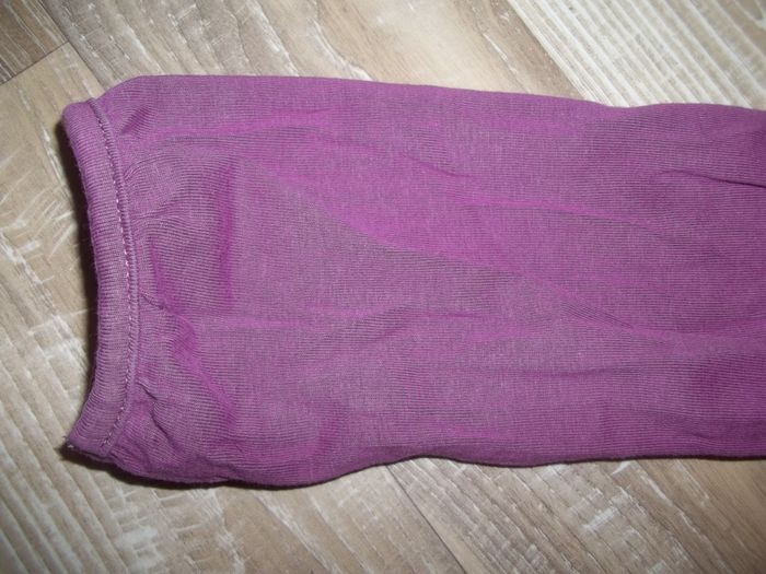 Tee-shirt à manches longues et col roulé (jersey double épaisseur de 14 cm à replier). 95 % coton bio 5 % élasthanne, uni violet, petites fronces poitrine, épaules et poignets, ouverture dos col fermée par 5 pressions. Longueur 41 cm, manches 38 cm, largeur épaules 26 cm, aisselles 31 cm, poignets 8 cm. Quasiment neuf.