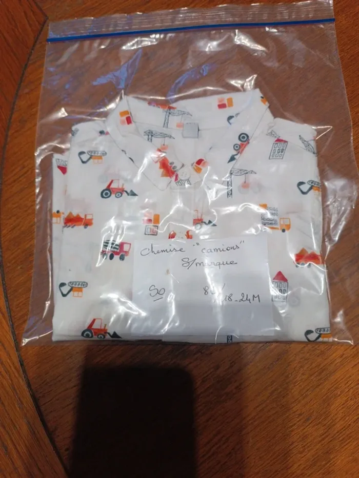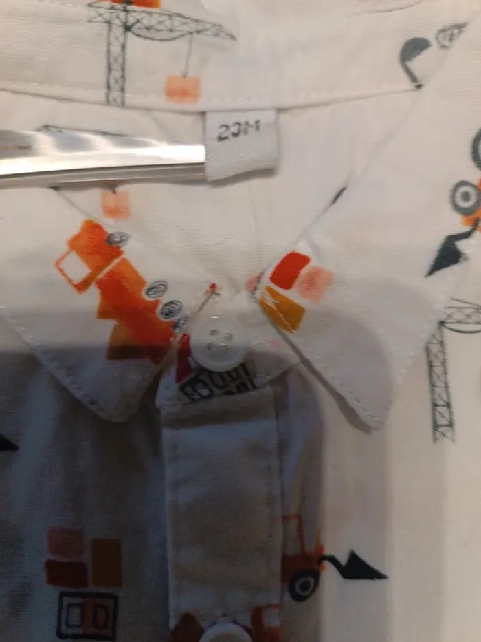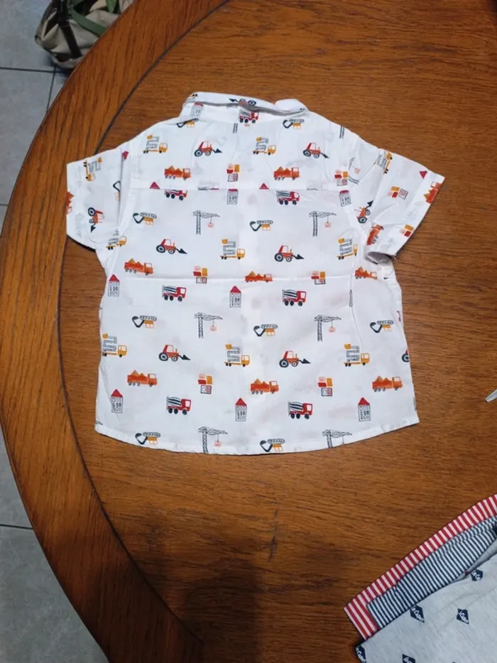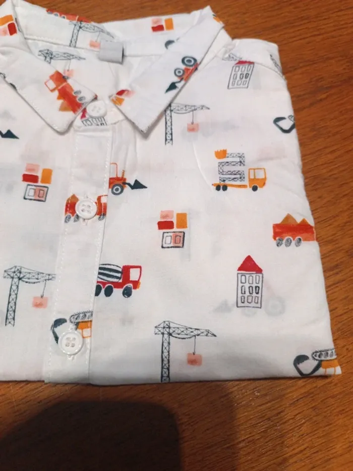 Chemise blanche décor camions, sans marque, 86-18/24M. 100% coton. Neuve.