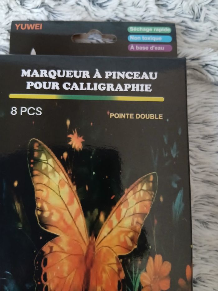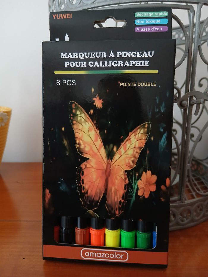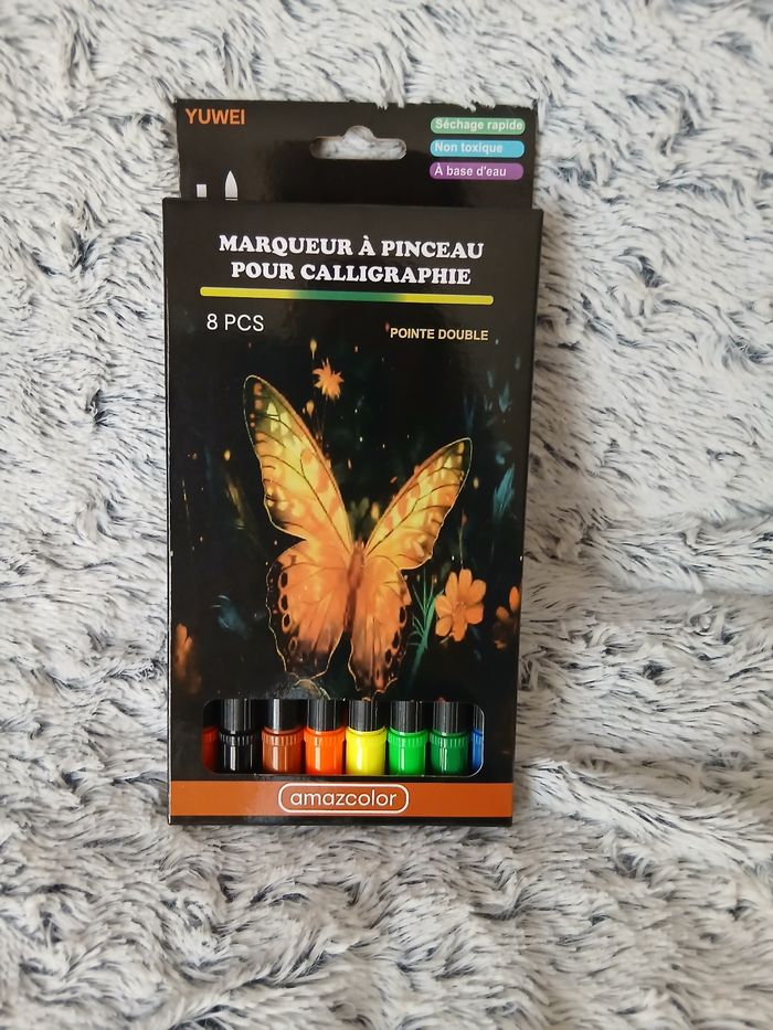 Article Neuf. Paquet de 8 marqueurs à pinceaux pour calligraphie; 8 coloris. Pointe double; séchage rapide; à base d'eau // voir photos pour détails