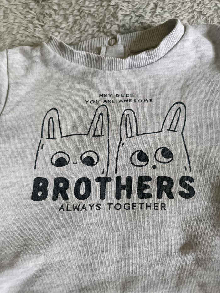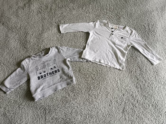 Joli lot de 2 hauts manches longues composé de : ✔️ Un sweat gris à motif “Brothers” 🐰 ✔️ Un haut écru à boutons, style basique et intemporel 📌 Taille : 6 mois 📌 Marques : Zara & Kiabi 📌 État : très bon état, peu portés 👉 Faciles à assortir, confortables pour le quotidien 👉 Petit prix pour un joli lot 👉 Envoi rapide 📦 👉 Découvre aussi mon dressing pour créer ton lot