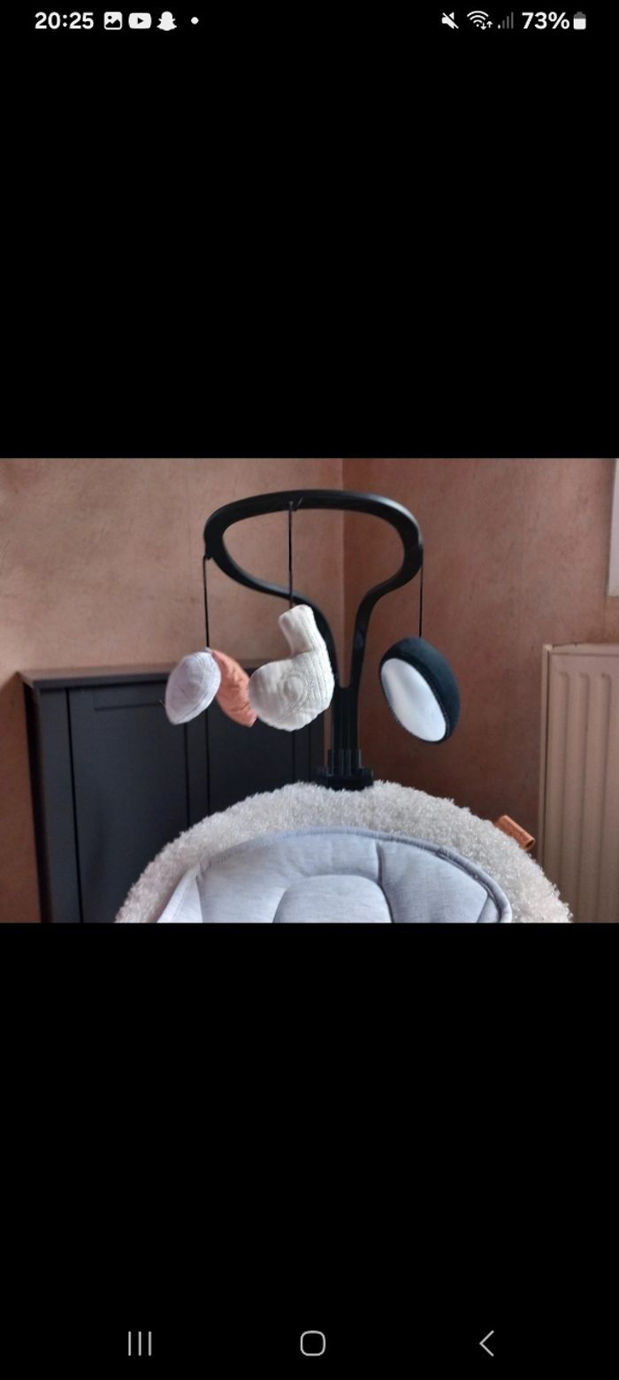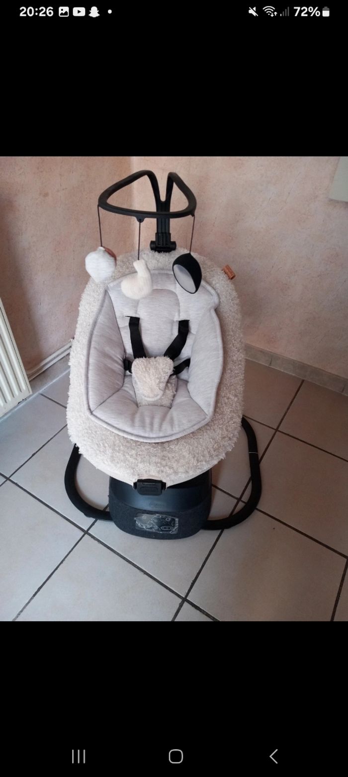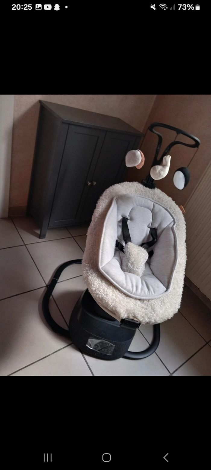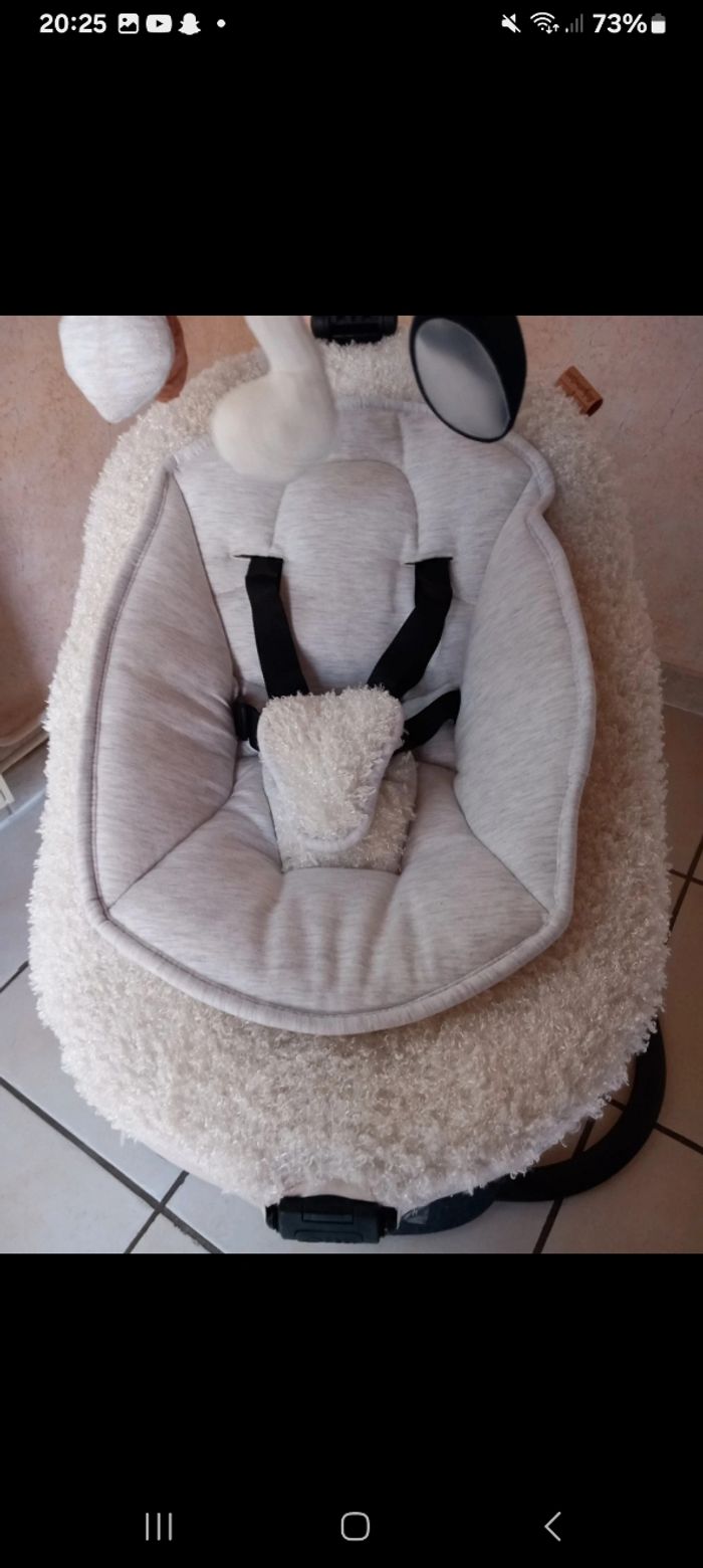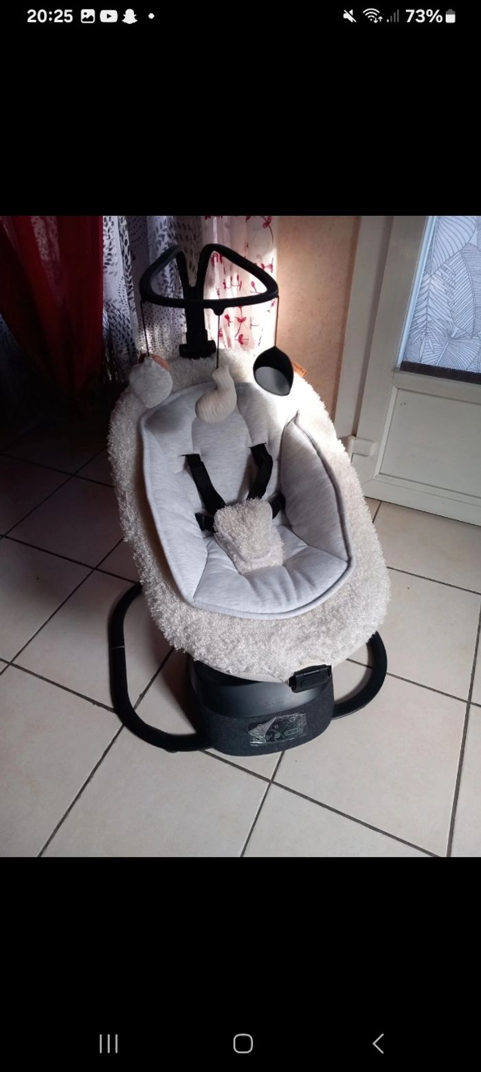 Je cède cette magnifique balancelle super douce acheter pour mon Petit dernier chez bébé 9 vendue avec la facture . il ne veut pas aller dedans elle et neuve encore en carton protection ..... sortie pour la photo acheter chez bebe9 289euros99 je la cède à 170 euros dès la naissance . Véritable bijou technologique, elle propose 8 mouvements de balancement ultra-fluides sur 5 vitesses. L’assise est rotative à 360° pour vous permettre d’adapter la position de votre enfant selon vos besoins. L’assise est réglable selon 5 positions pour offrir un confort optimal à bébé. Côté sécurité, un harnais 5 points le maintiendra bien en place. Parfaite pour se reposer grâce à ses 12 berceuses, cette balancelle sait aussi amuser bébé : elle est équipée d’une arche de jeux avec 3 jouets d’éveils qui stimuleront les sens et la motricité de votre enfant. Son design moderne et élégant a été imaginé avec Lucie, une maman de 3 enfants connue sur instagram avec le pseudo @Babyatoutprix. Cette créatrice est reconnue pour son expertise dans l’univers de l’enfance, sa passion pour les belles créations, le design et les produits premium. Caractéristiques : 8 mouvements ultra fluides Système de rotation de l’assise à 360° Assise ajustable sur 5 positions (dossier 2 positions) et assise (3 positions) réglables indépendamment Design co-crée avec une influenceuse Durée de bercement programmable (10, 20 ou 30 minutes) Télécommande incluse pour faire les réglages à distance Arche de jeux avec 3 jouets d’éveils ajustables sur 3 positions et amovible 12 berceuses intégrées avec volumes réglables Réducteur nouveau-né et housse amovibles Harnais de sécurité 5 points Adaptateur secteur inclus Balancelle démontable Garantie à vie Fonctionne sur secteur (adaptateur inclus)