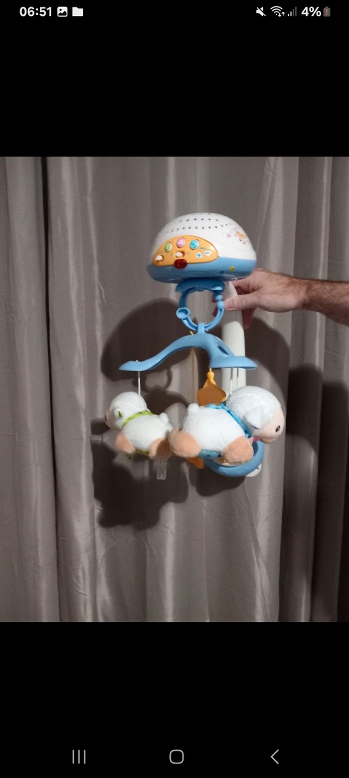 Mobile musicale vtech avec petits moutons. Mobile 3 en 1 avec télécommande Le globe lumineux est détachable et s'utilise comme projecteur ou simple veilleuse Sâ€attache facilement à tous les types de lits munis de barreaux Minuterie pour écouter 5, 15 ou 30 minutes de musique en continu