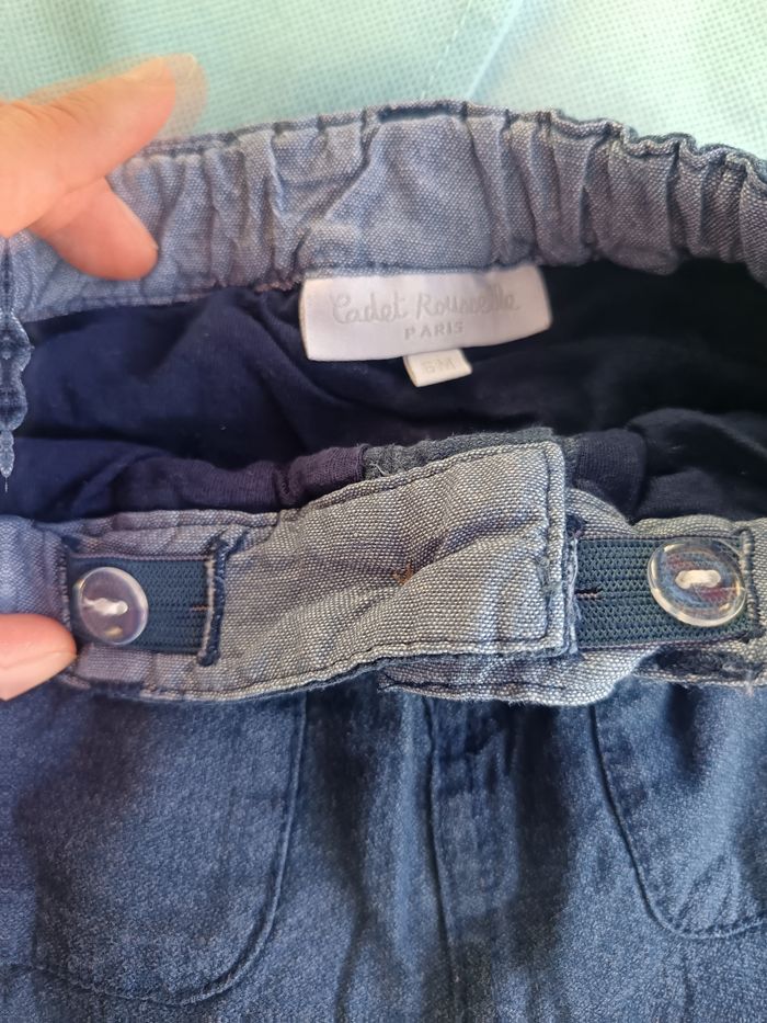 Pantalon ressemblant à un jean mais matière tissu. Élastique avec boutons pour resserrer à la taille. Marque cadet rousselle en taille 6 mois. État comme neuf