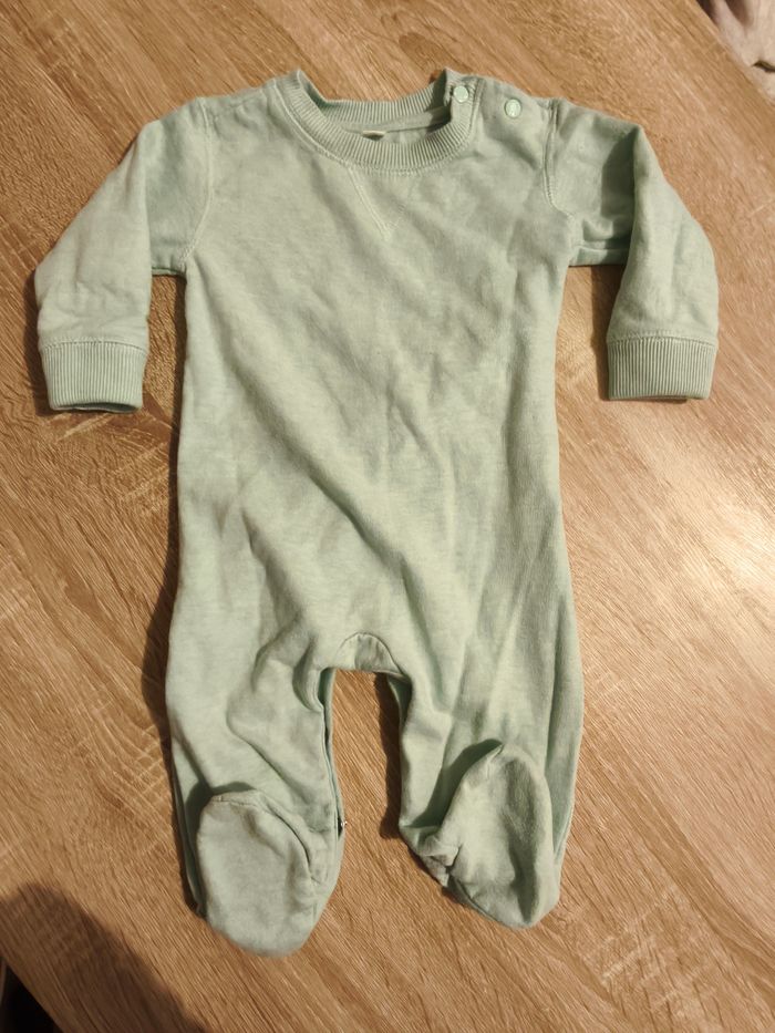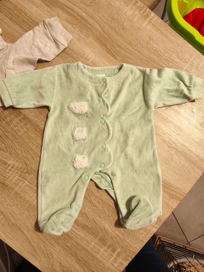 Lot de vêtements comprenant (dans l'ordre des photos) : - Pull 3 mois Kiabi - Pyjama naissance sans marque - Pyjama 9 mois sans marque - Manteau polaire avec capuche 1 mois Kiabi - Manteau 9 mois sans marque