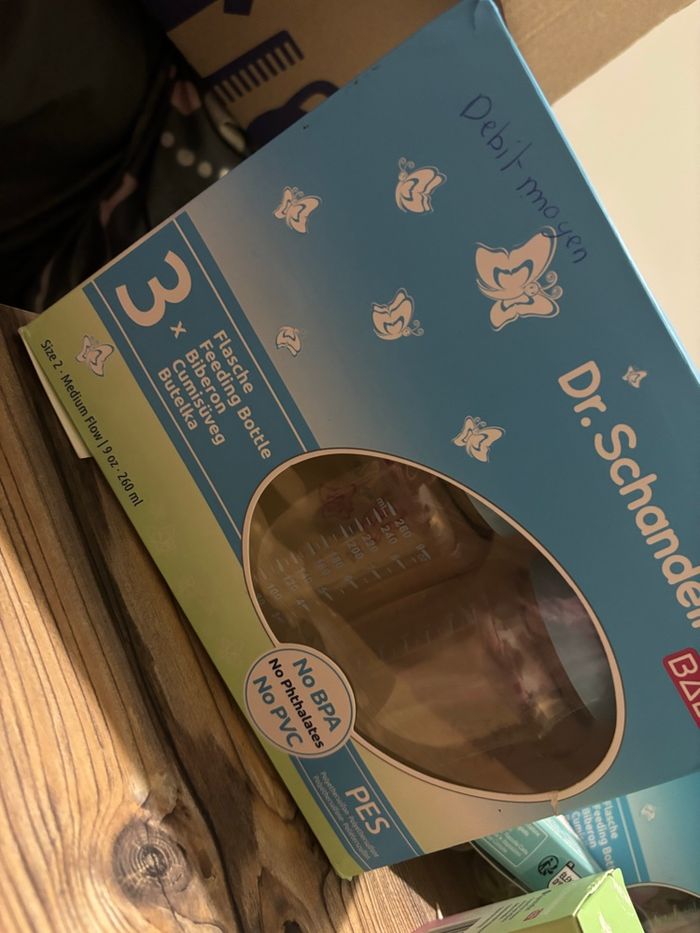 Coffret biberons débit moyen Le carton et en dessous et craqué mais j’ai recoller avec du scotch et les biberons sont intacts