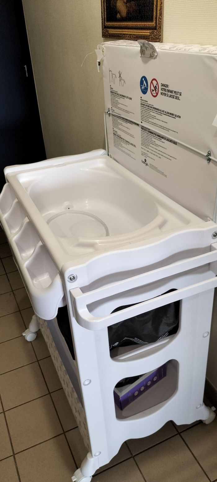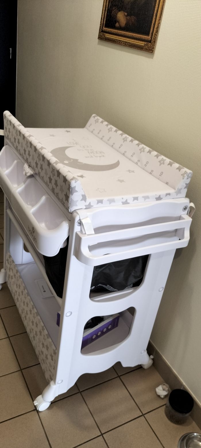 Table à langer rembourrée avec Baignoire pour bébé intégrée très bon état. Avec de nombreux espaces de rangement pour les accessoires de bébé Poids maximal : 11 kg Contenu : 1x table à langer, 1x baignoire, 1x matelas à langer, 1x tuyau d'évacuation, rangements Dimensions de la table : 87L x 51l x 102H cm Dimensions de la baignoire : 57L x 33l x 17H cm Dimensions du matelas (côtés surélevés) : 73L x 34l x 11H cm