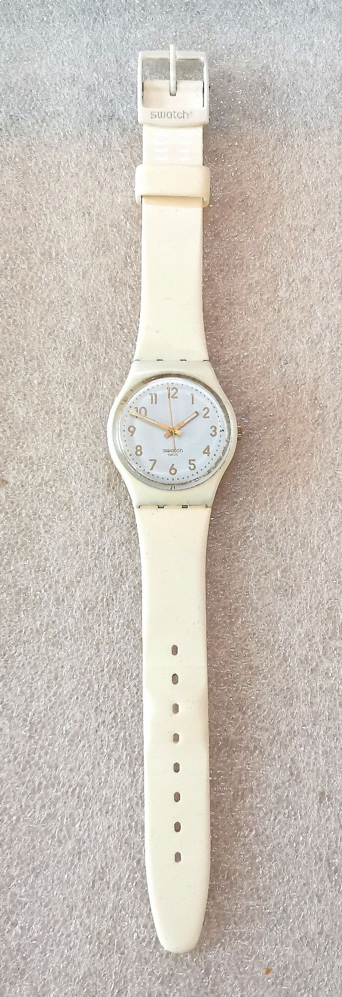 Montre SWATCH Collecteur "White Bishop", GW 164, Collection Gents, boîtier blanc de 34 mm à intérieur blanc, chiffres et aiguilles dorés, (ayant était portée, présente des traces d'usure, voir griffures visibles sur le verre), et bracelet en silicone couleur blanc assorti, en parfait état de fonctionnement, pile fourni, prix définitif.