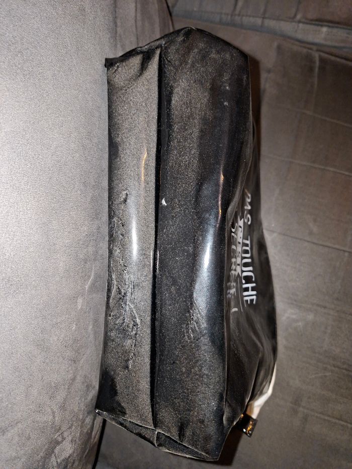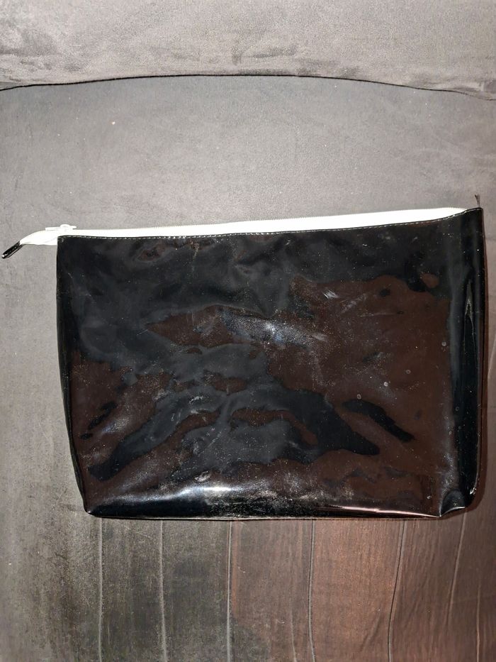 ​Je vends cette grande trousse de toilette noire au fini verni, originale et pleine d'humour avec son message "Pas Touche C'est Top Secret !". ​Sa grande capacité est son principal atout : elle est assez spacieuse pour contenir tous vos essentiels (shampoings, gels douche, brosses, maquillage, produits de soin) pour toute la famille ou pour un long voyage. ​Dimensions généreuses : 35 cm (longueur) x 23 cm (hauteur). ​Largeur au fond : 9 cm (elle tient bien debout une fois remplie). ​Matière : Revêtement noir brillant, très pratique car imperméable et lavable d'un coup d'éponge. ​Fermeture : Zip blanc robuste. ​Intérieur : Entièrement doublé en blanc. ​État : Bon état général. ​Idéale pour les vacances, le sport ou pour organiser vos produits de beauté à la maison.