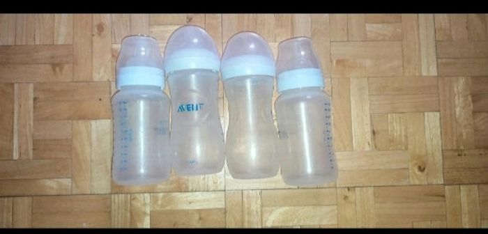 Lot 4 biberons avent 330mL Bien servi, en bon état (inscriptions effacées sur 2)