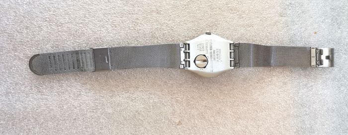 Montre SWATCH "Paroussia", YLS 1006M, Collection Irony Medium, boîtier de 33,5 mm, en aluminium argenté, à intérieur argenté, chiffres et aiguilles argent, et bracelet maille milanaise en métal argenté assorti, en parfait état de fonctionnement, pile fourni, prix définitif.