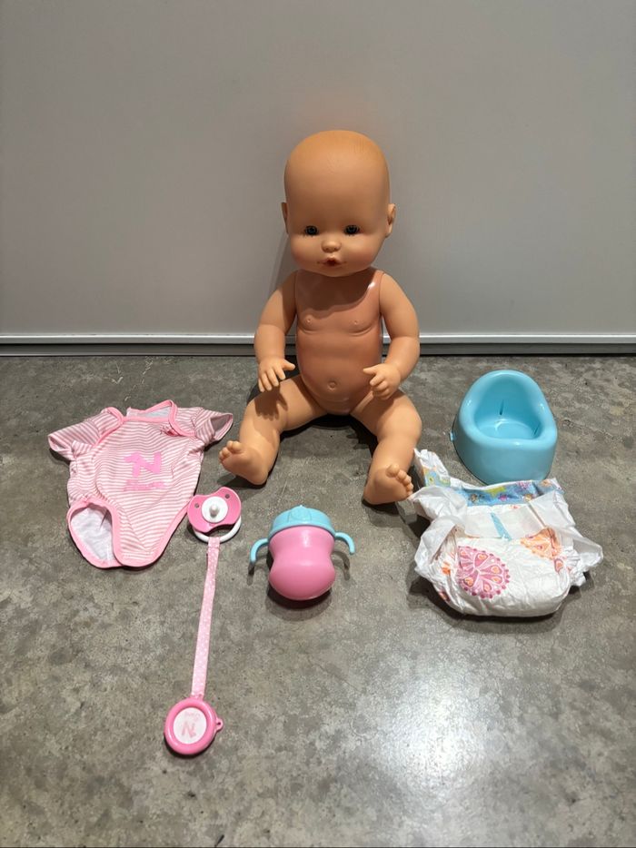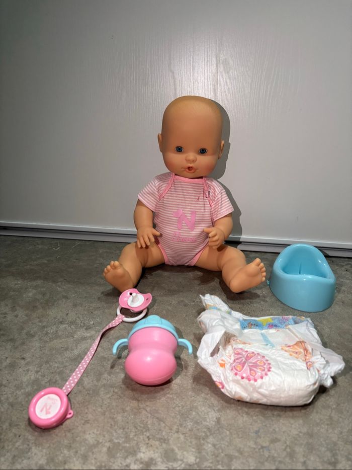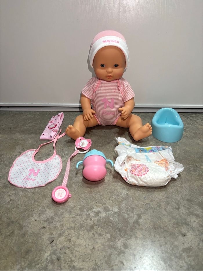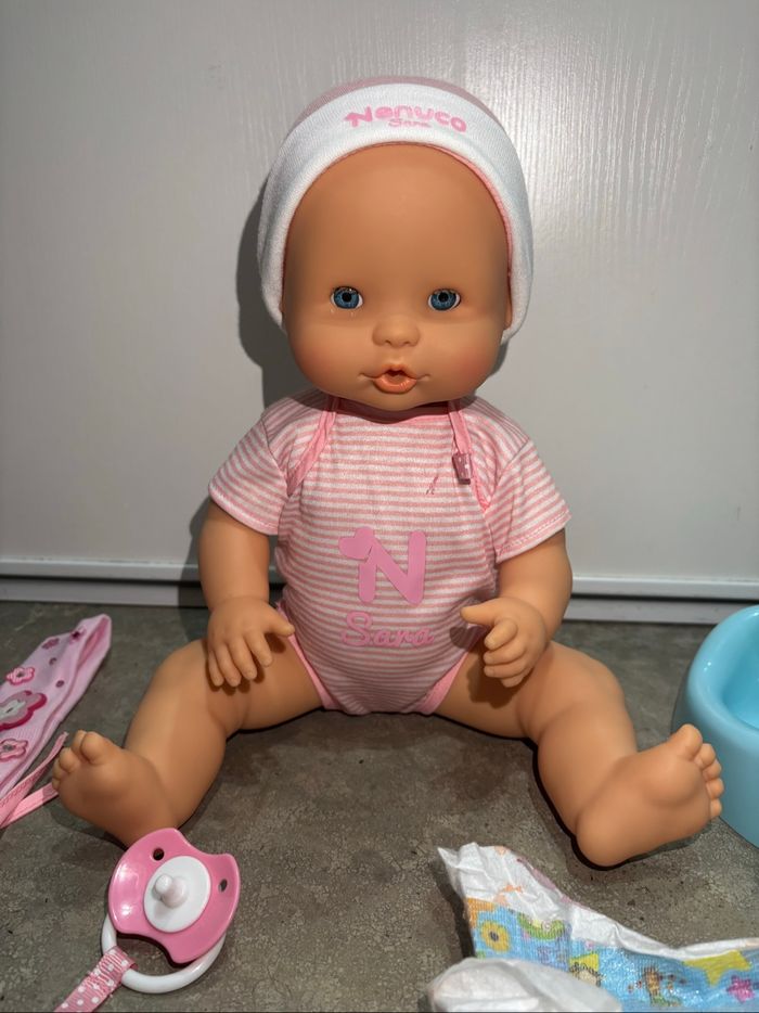 Prix non négociable Poupée bébé sara nenuco en très bon état avec accessoires. Nenuco sara est une poupée à apparence réelle qui regroupe 11 fonctions et qui fonctionne sans pile Sara Nenuco fait tout: elle ferme les yeux pour dormir, elle mange, elle boit, elle fait pipi au pot, elle fait popo au pot, son fessier s’irrite, elle pleure à chaudes larmes, elle bave, on peut lui faire prendre le bain, elle bouge les bras et les jambes et elle sent bon comme un vrai bébé. Poupée au corps dur de 42cm.