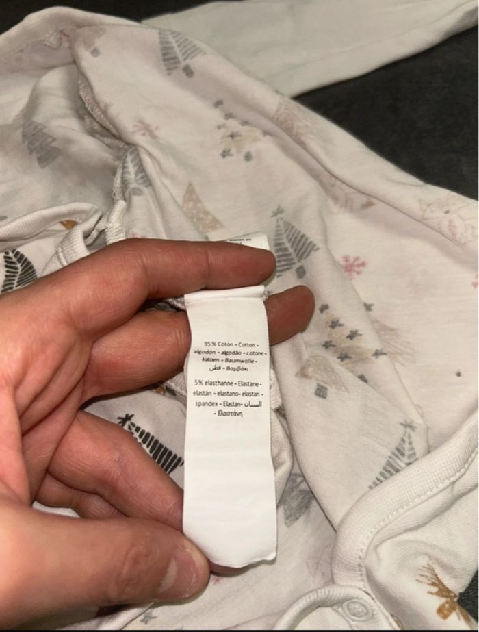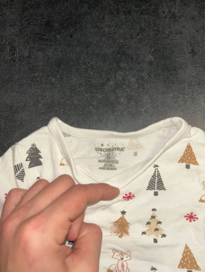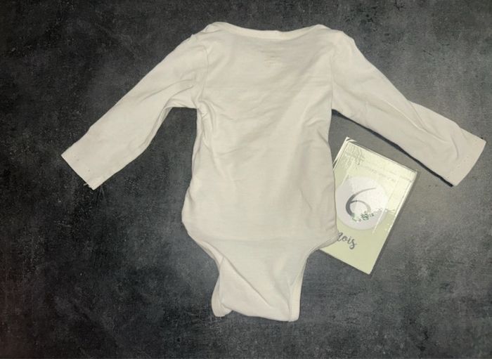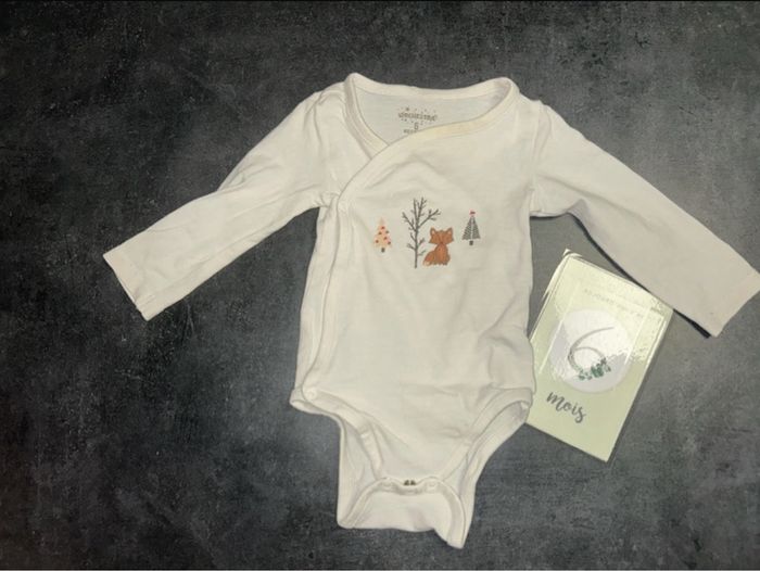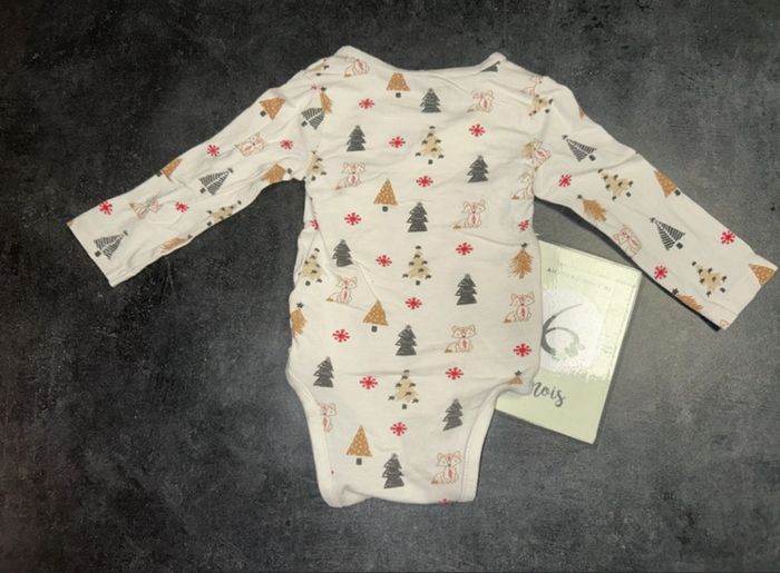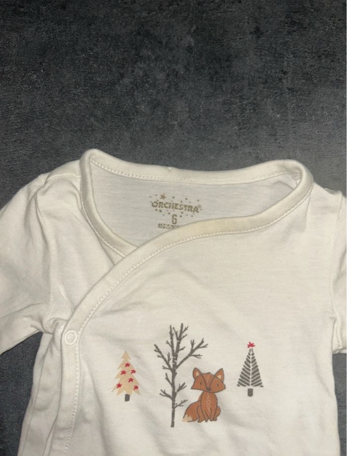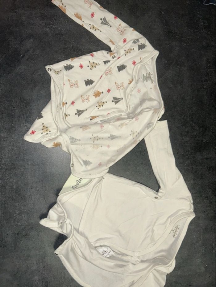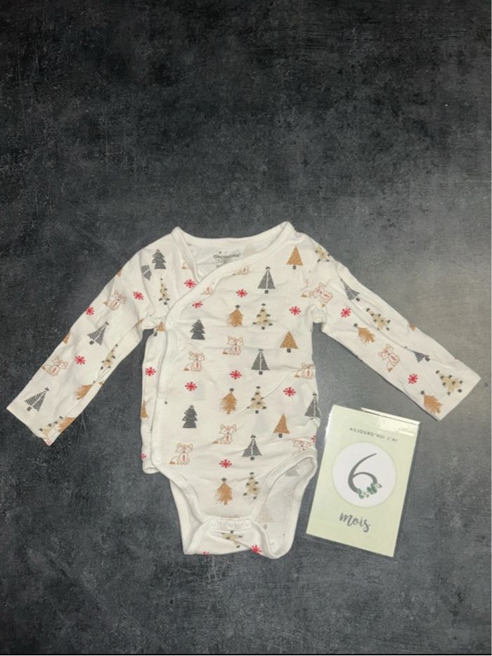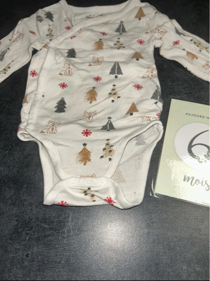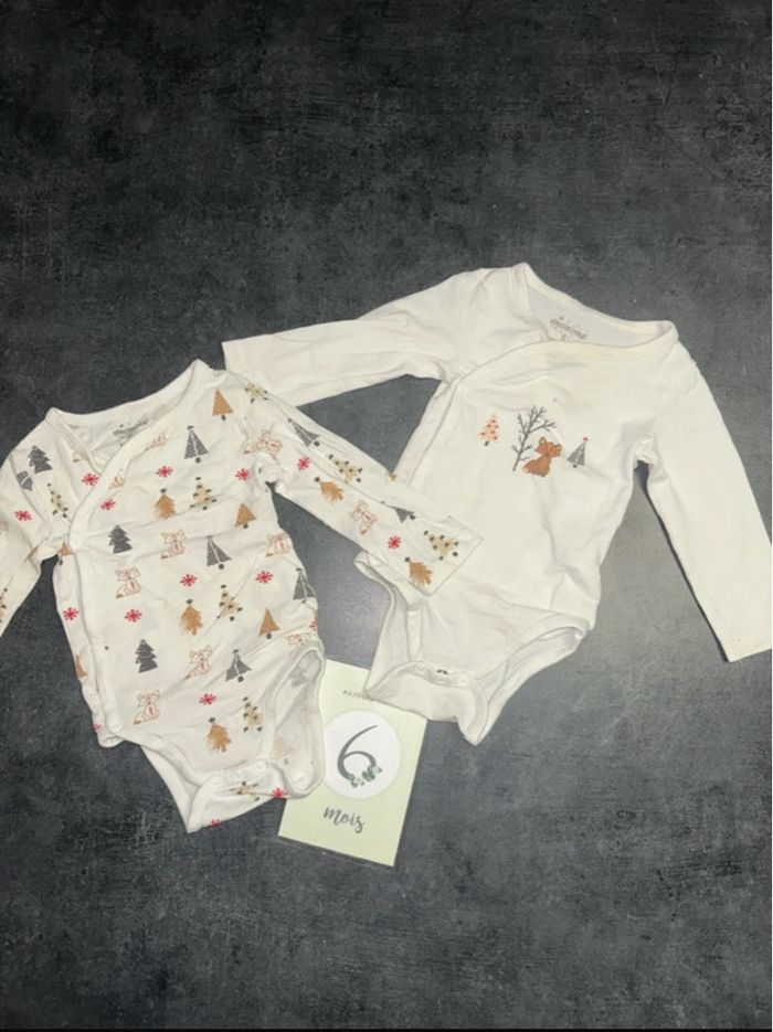Lot de 2 bodies bébé 1 blanc avec plusieurs petits motifs renards/sapins/flocons 1 blanc avec moins de motifs mais le col très légèrement jaunis Ouverture par pressions sur le ventre et au niveau de la couche Taille : 6 mois/67 cm Mixte : peut convenir à une petite fille ou à un petit garçon