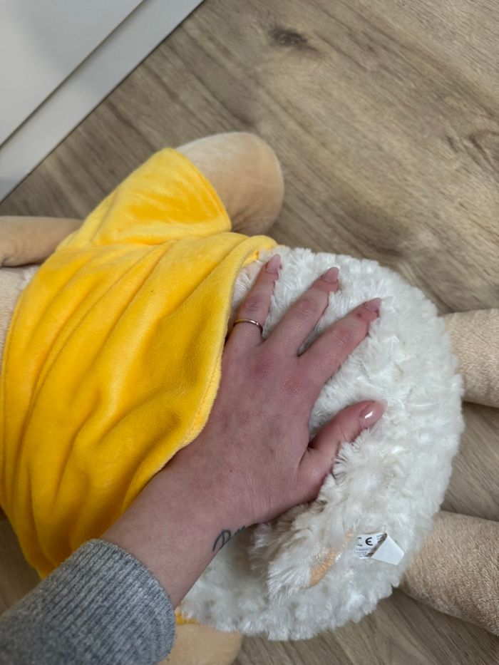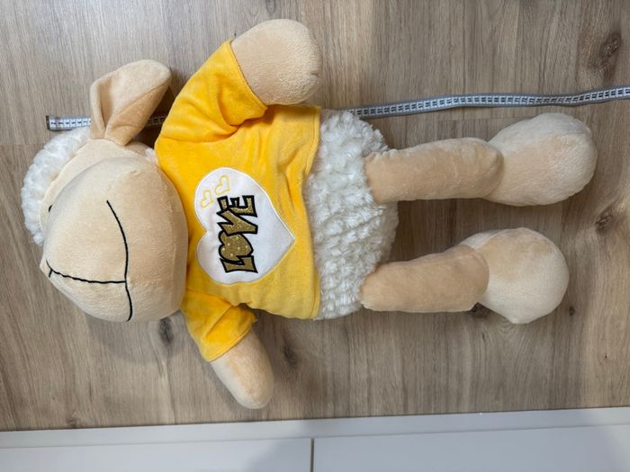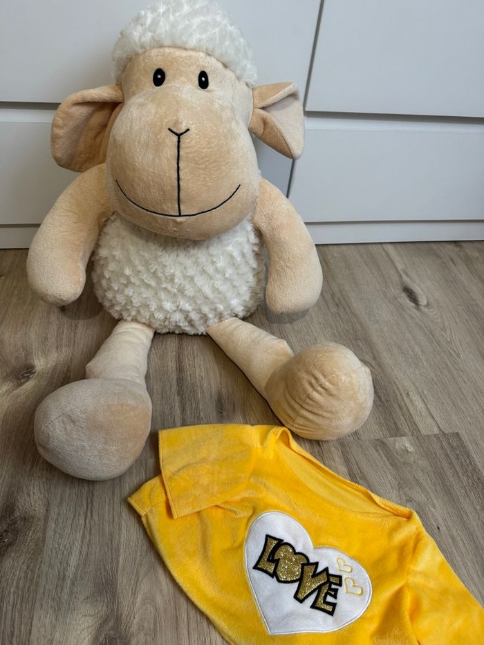 Grande peluche mouton Reçu en cadeau à la naissance de mon fils mais malgré sa douceur et sa mignonnerie, elle ne l’intéresse pas du tout il préfère les dinosaures 🦖 🥲 Peluche toute douce Le t-shirt de la peluche peut être enlevé Elle mesure +-75cm En parfait état elle apportait une touche à la déco.