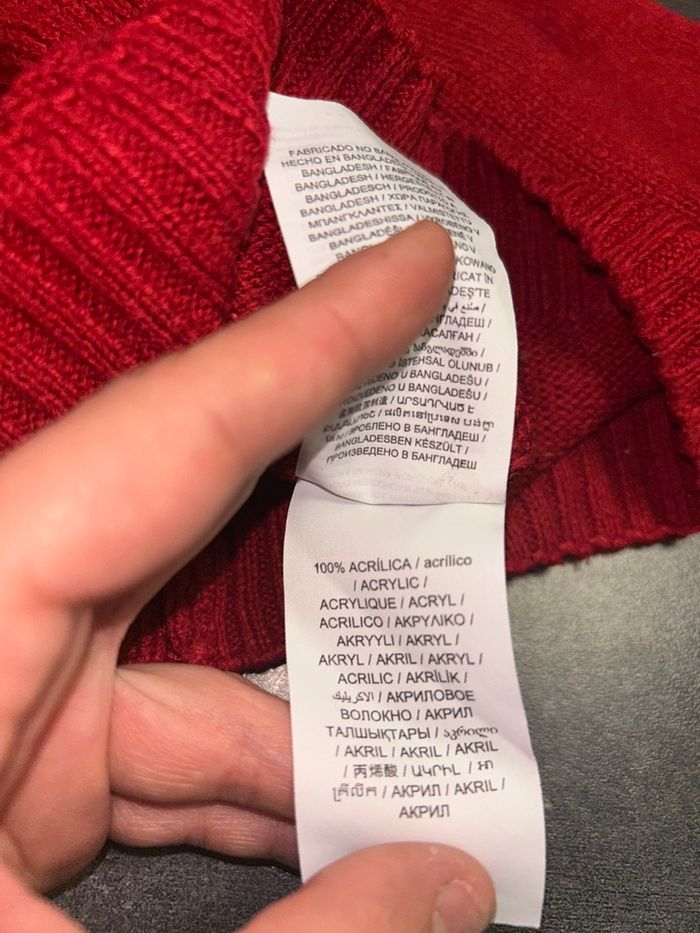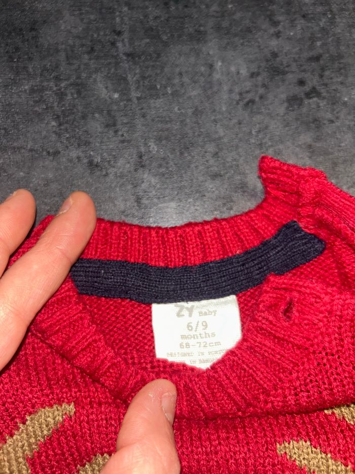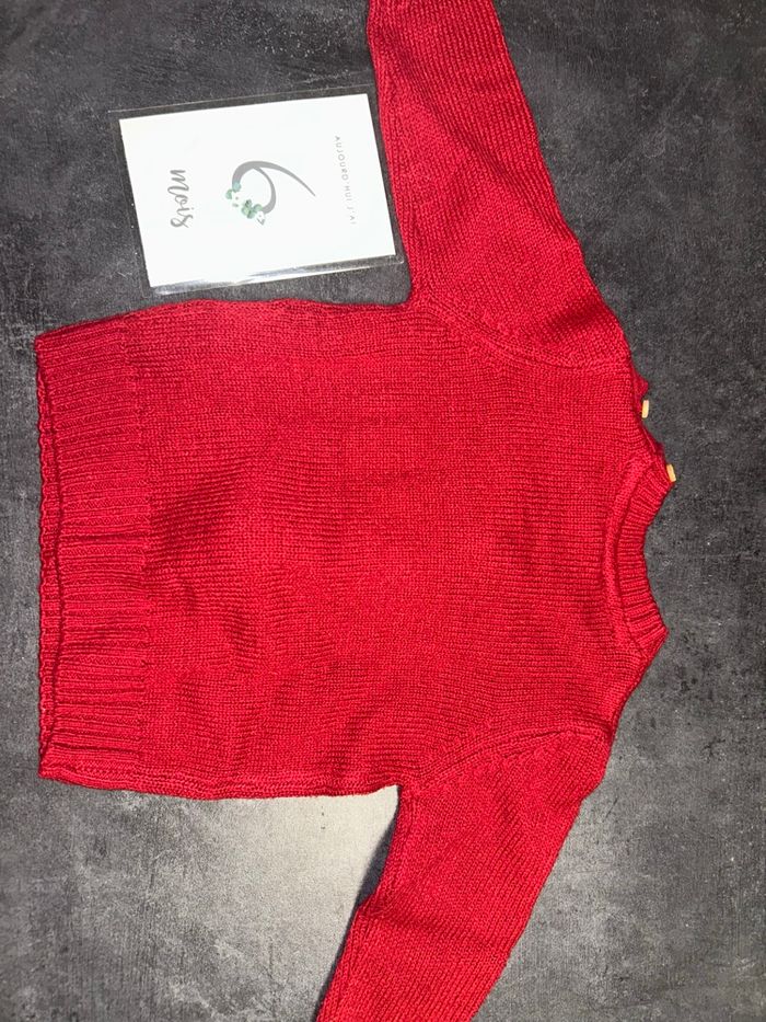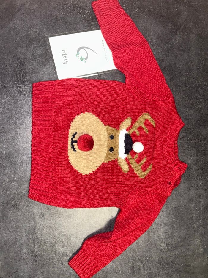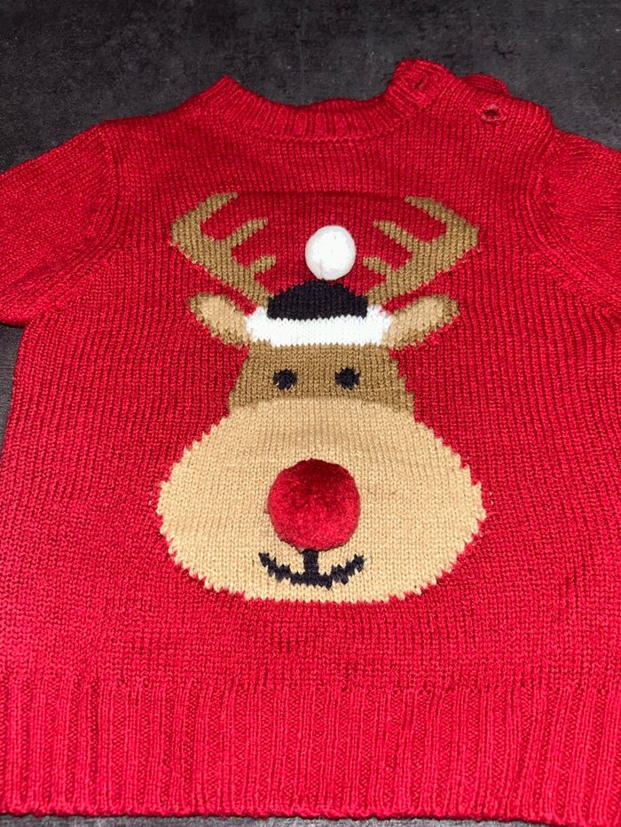 Pull couleur rouge avec motif reine de Noël avec nez en relief 2 boutons au niveau de l’épaule Taille : 6-9 mois/66-72 cm