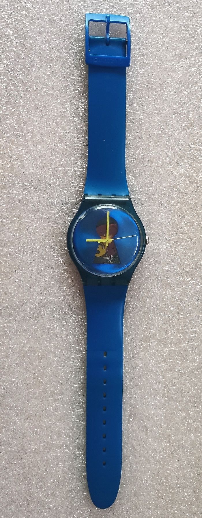 Montre SWATCH Collecteur "Open it", SUOZ 157STD, Collection New Gents Special Club 2012, boîtier bleu de 41 mm, à intérieur bleu, a travers sont trou de cerrure, ont peut apercevoir son mécanisme, aiguilles et trotteuse couleur jaune, et bracelet en silicone couleur bleu assorti, en parfait état de fonctionnement, pile fourni, prix définitif.
