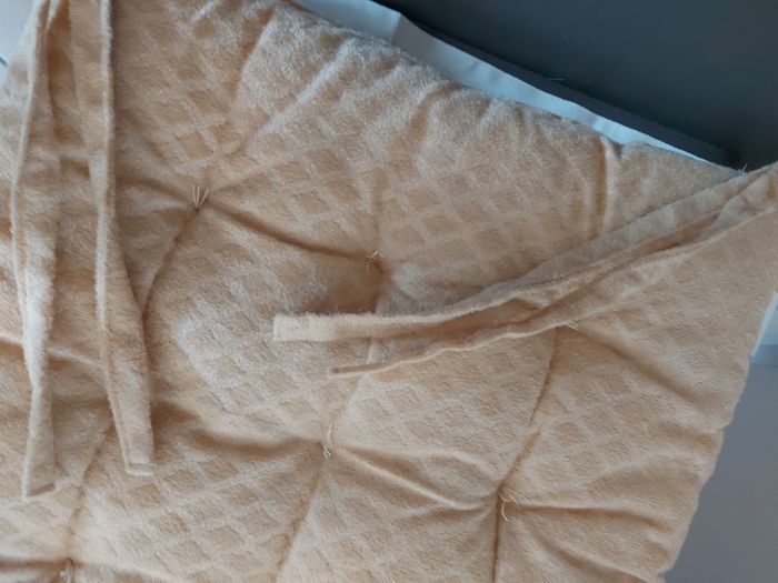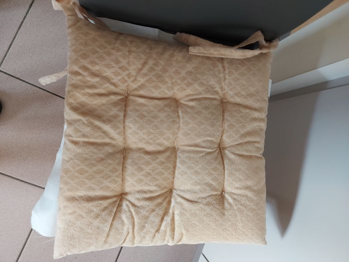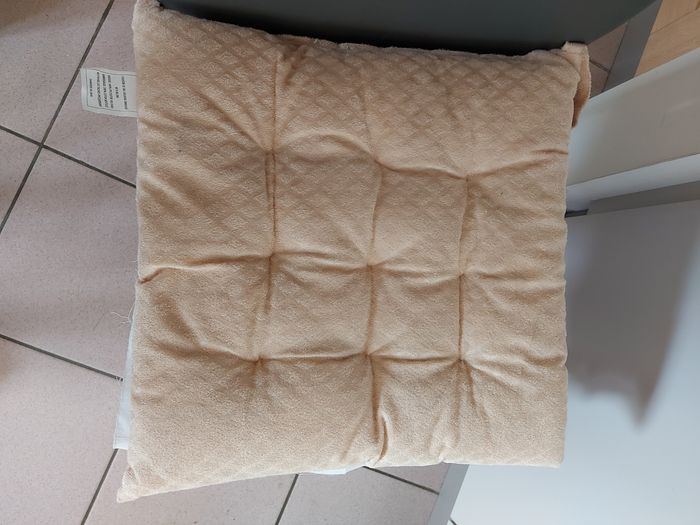 Galette de chaise, beige, velours, avec attaches 40 x 40 cm A tache sur une face à cause de l'entreposage, voir photos Neuve