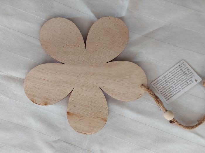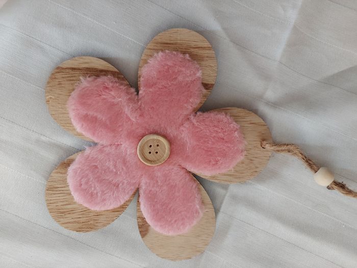 Suspension en bois et corde, intérieur faux poils roses Fleur diamètre environ 16 cm Neuve