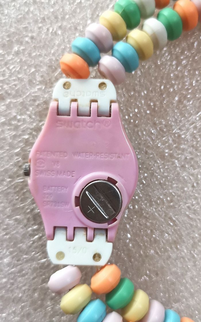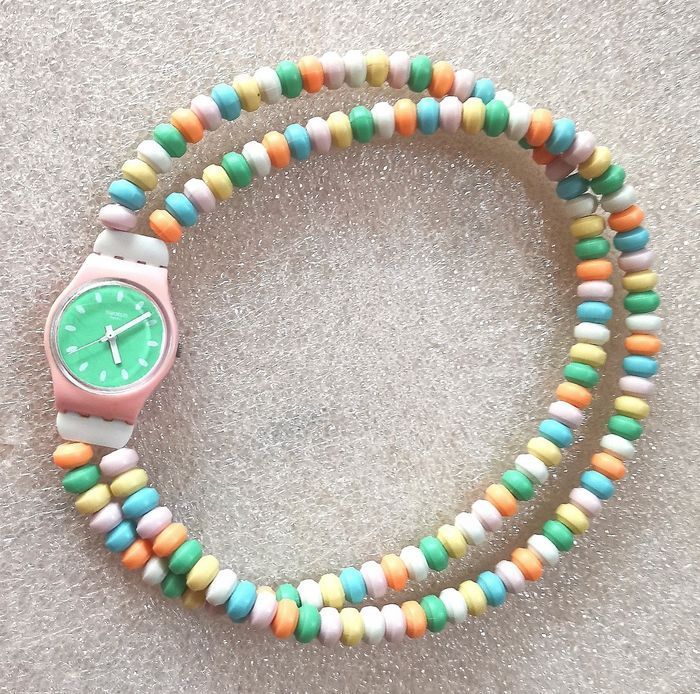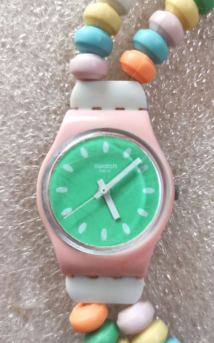 Montre SWATCH Collecteur Vintage "Caramellissima", LP 135, Specials Collection Ladies, boîtier rose pastel de 25 mm, à intérieur vert, points blanc pour les chiffres, aiguilles et trotteuse blanches, (Portée souvent, présente de traces d'usure, griffures visibles sur le verre, polissage à prévoir), et façon bonbons colorés, en parfait état de fonctionnement, pile fourni, prix définitif.