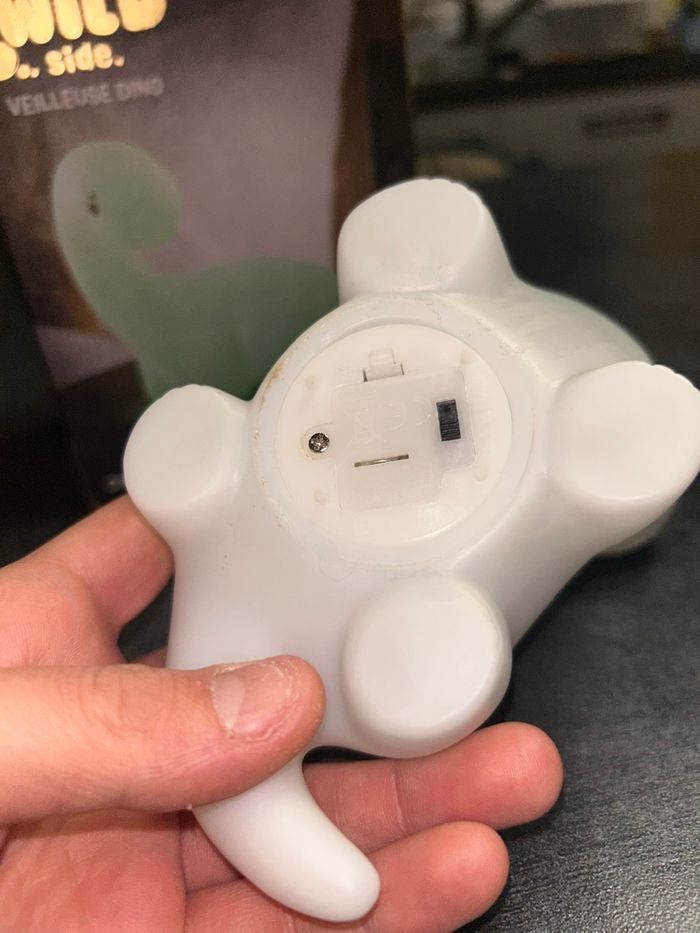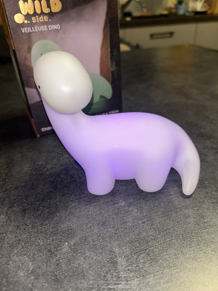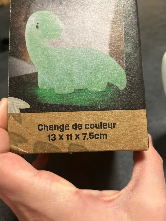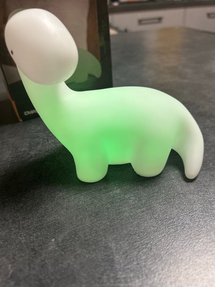 Veilleuse Dino qui change de couleur Dimensions : 13 x 11 x 7,5 cm Fonctionne parfaitement Les piles n’ont jamais été changé