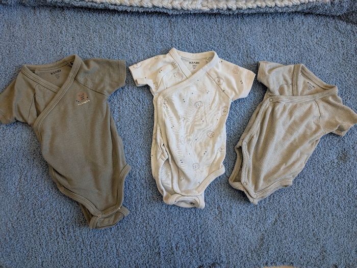 Lot de 3 bodies manches courtes fermeture a pressions façon cache coeur Évolutif avec pression supplémentaire au niveau de l entre jambe Taille 3 mois Marque Kiabi Pas de tâches ni de trou