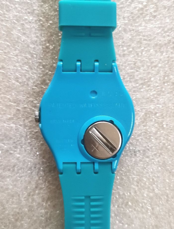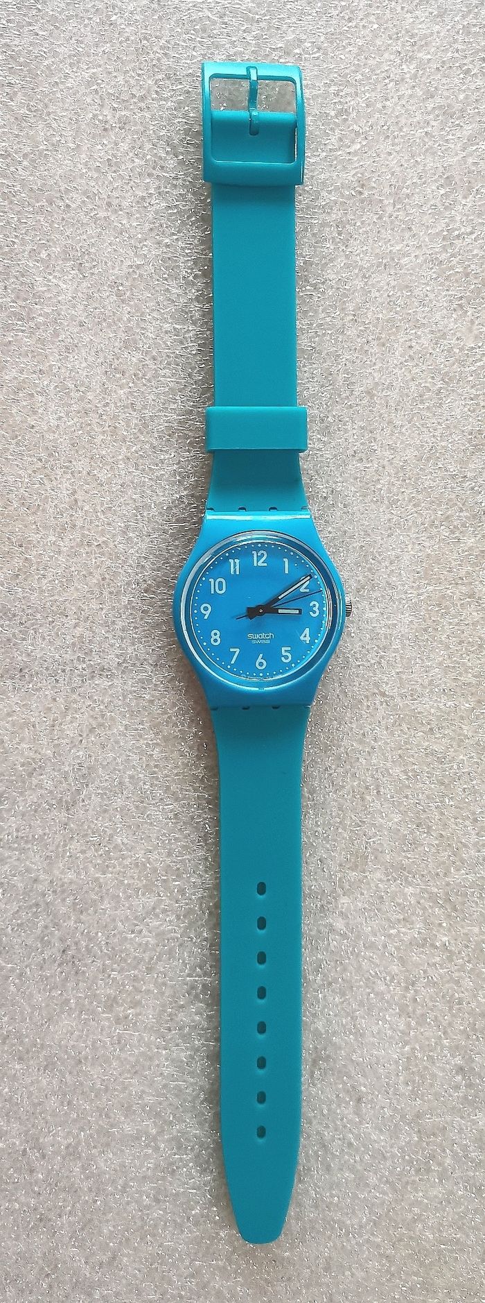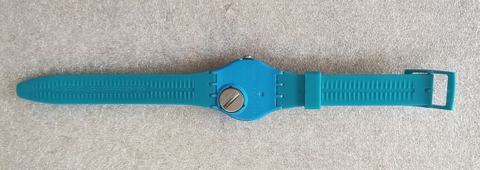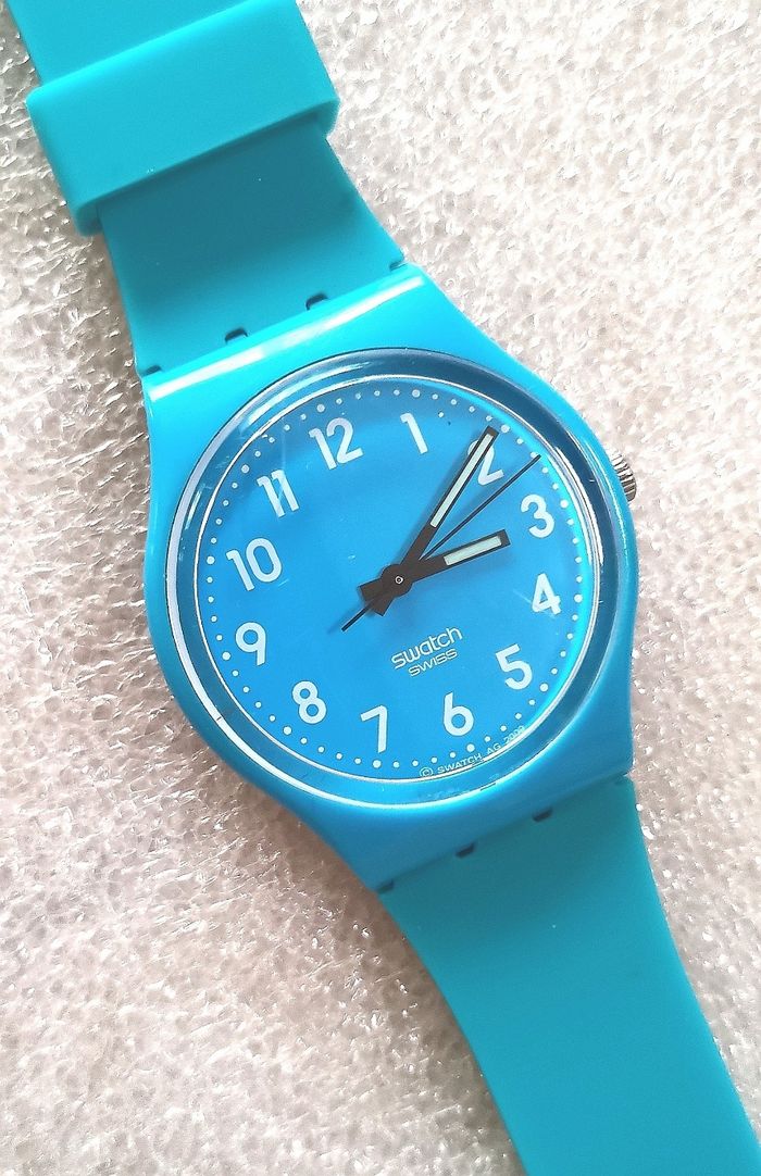 Montre SWATCH Collecteur Vintage "Rise Up", GS 138, Collection Gents Les Originales 2009, boîtier couleur turquoise de 34 mm, intérieur turquoise, chiffres blanches, aiguilles noir et blanc et trotteuse noir, et bracelet en silicone couleur turquoise assorti, en parfait état de fonctionnement, pile fourni, prix définitif.