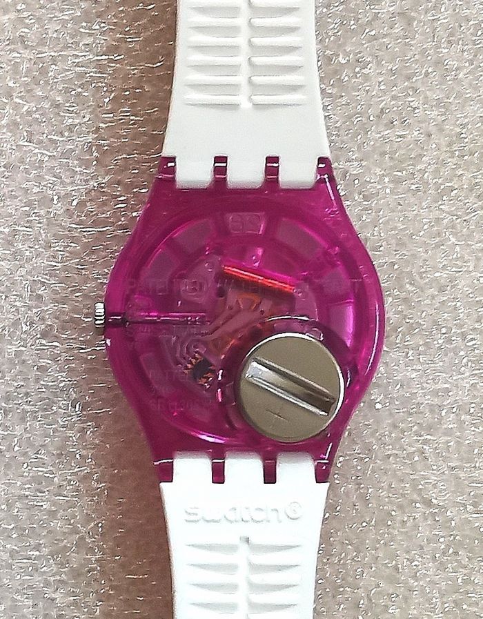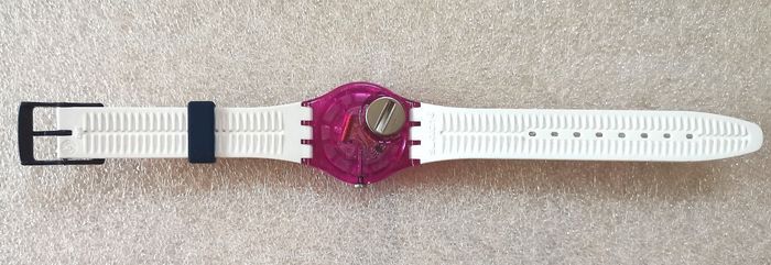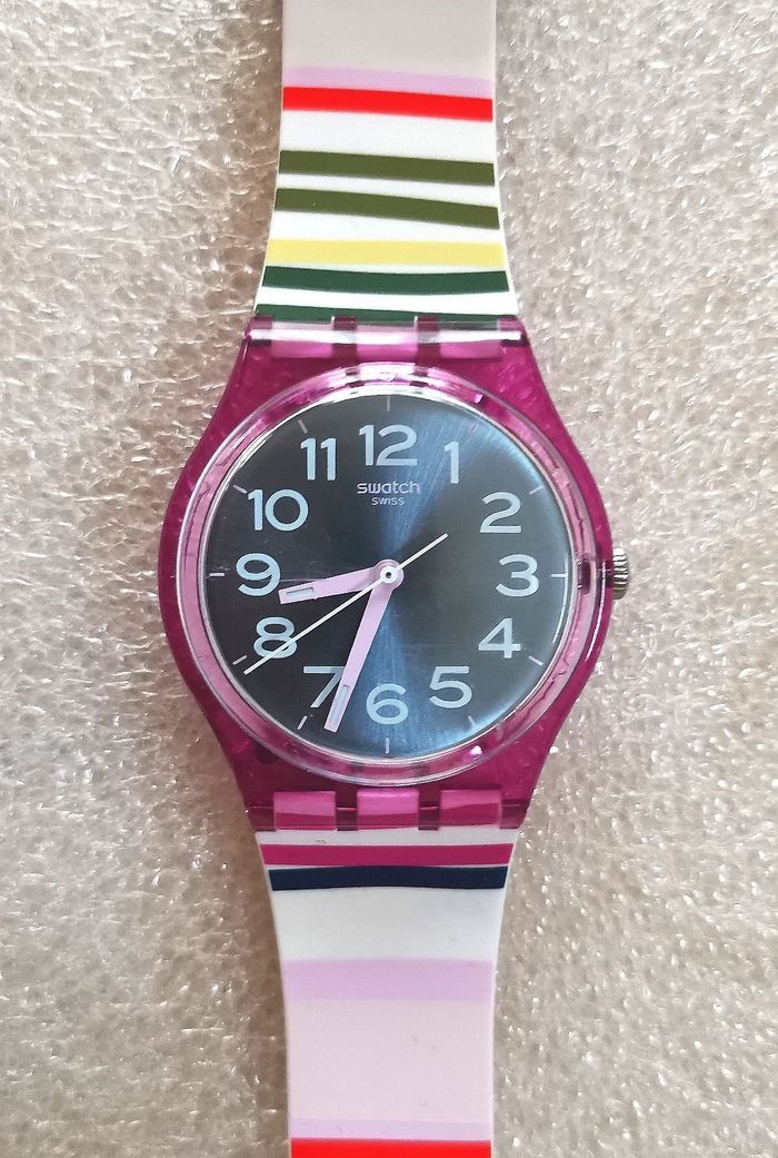 Montre SWATCH Collecteur "Funny Lines", GP 153, Collection Gents, boîtier magenta 34 mm à intérieur anthracite, chiffres blanches, aiguilles roses et trotteuse blanche, et bracelet en silicone à rayures colorés, tbé, en parfait état de fonctionnement, pile fourni, prix définitif.