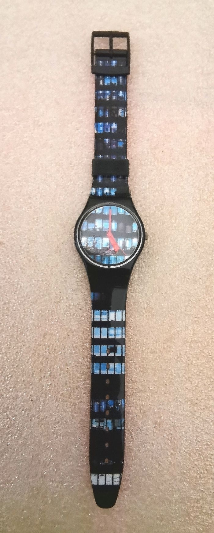 Montre SWATCH Collecteur Vintage "Overtime", GB 183, Collection SWATCH Klassker Gents 1997, boîtier bleu foncé de 34 mm à intérieur vue d'en face d'un immeuble, aiguilles rouges, et bracelet résine à motifs assorti, tbé, en parfait état de fonctionnement, pile fourni, prix définitif.