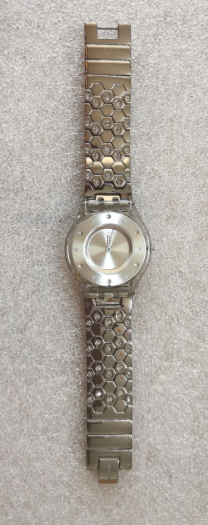 Montre SWATCH "Pamina", SFK 386, Collection Skin, boîtier ultra plat de 33,5 mm, à intérieur argent contour orné de cristaux blancs brillants, aiguilles argent, et bracelet bijou en métal argenté orné de cristaux blancs brillants assorti, tbé, en parfait état de fonctionnement, pile fourni, prix définitif.