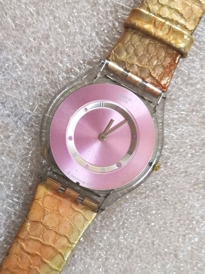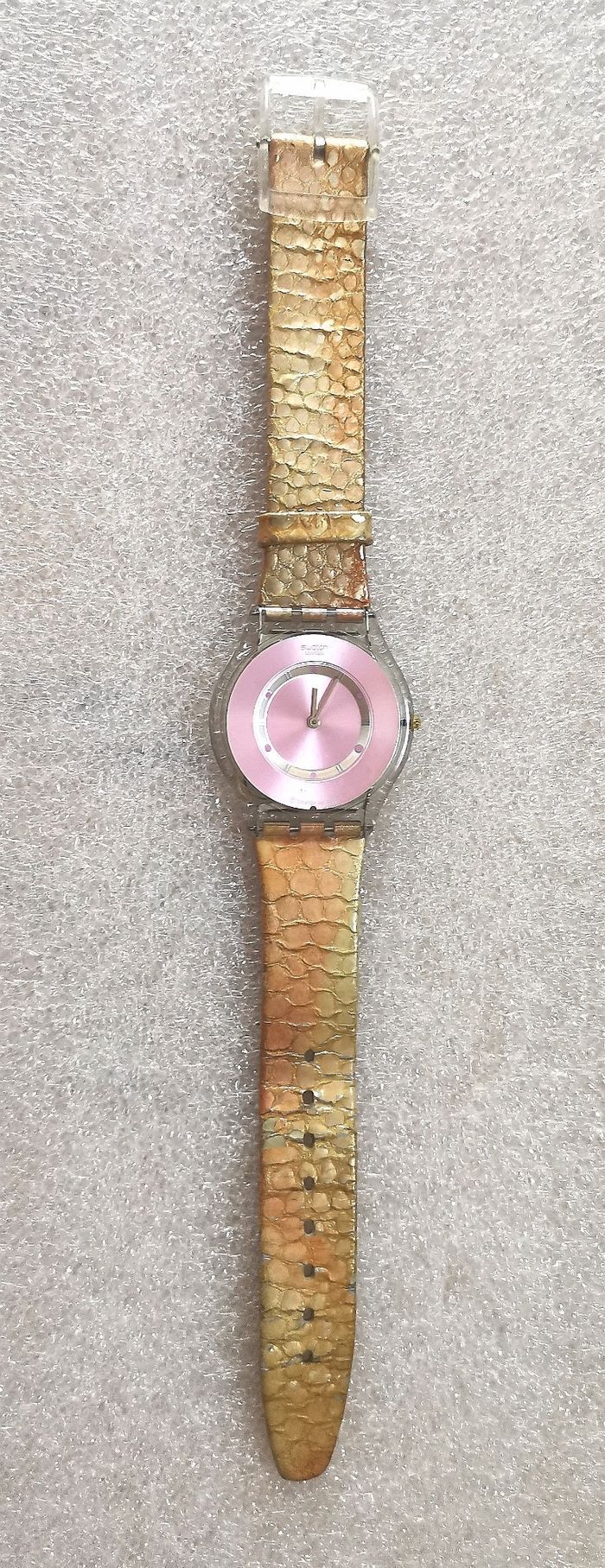 Montre SWATCH "Rosebalm", SFK 262, Collection Skin, boîtier ultra plat de 33,5 mm, à intérieur rose, aiguilles argent, et bracelet en cuir effet serpent, en parfait état de fonctionnement, pile fourni, prix définitif.