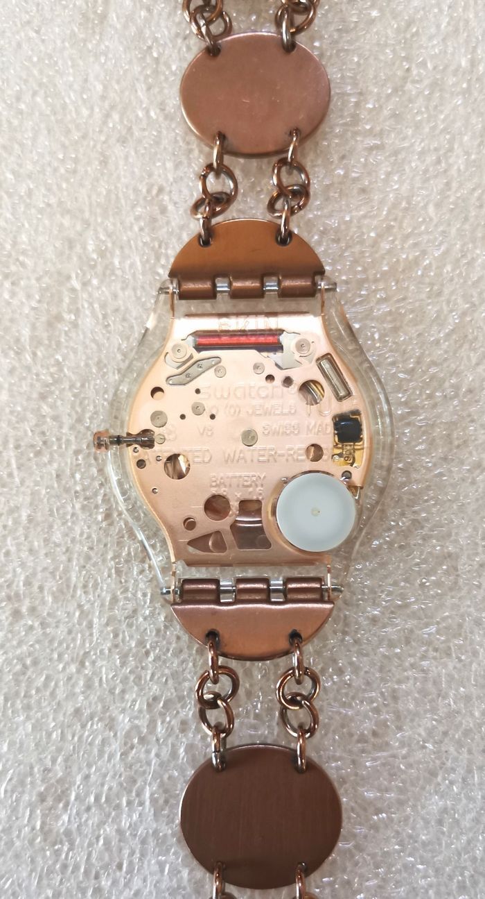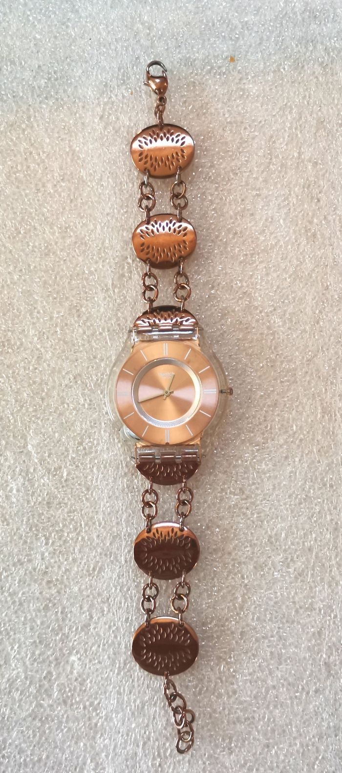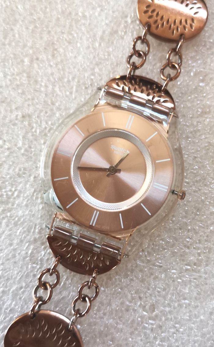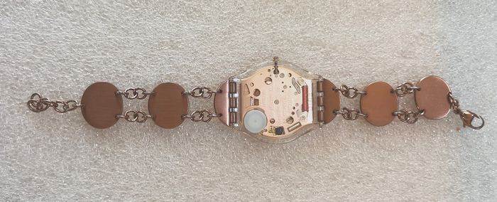Montre SWATCH "Hello Darling Dial", boîtier de 33,5 mm, intérieur et aiguilles couleur or rose et bracelet bijou assorti à fermeture à chaînette réglable, en parfait état de fonctionnement, pile fourni, prix définitif.
