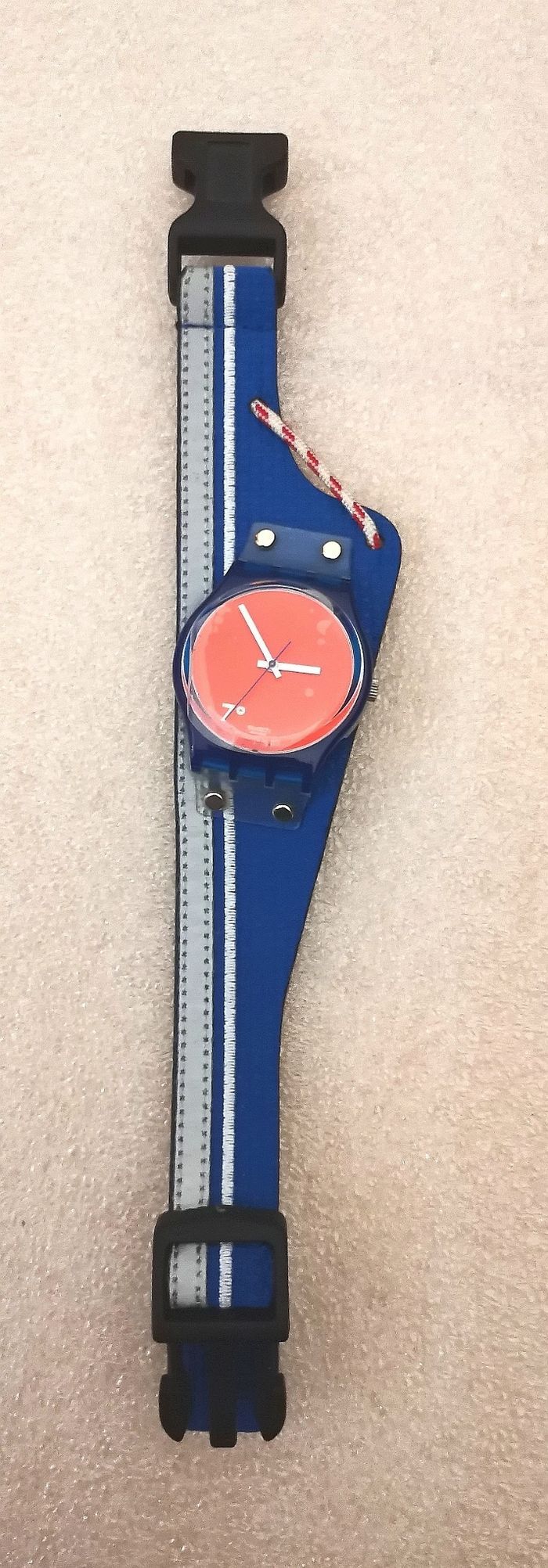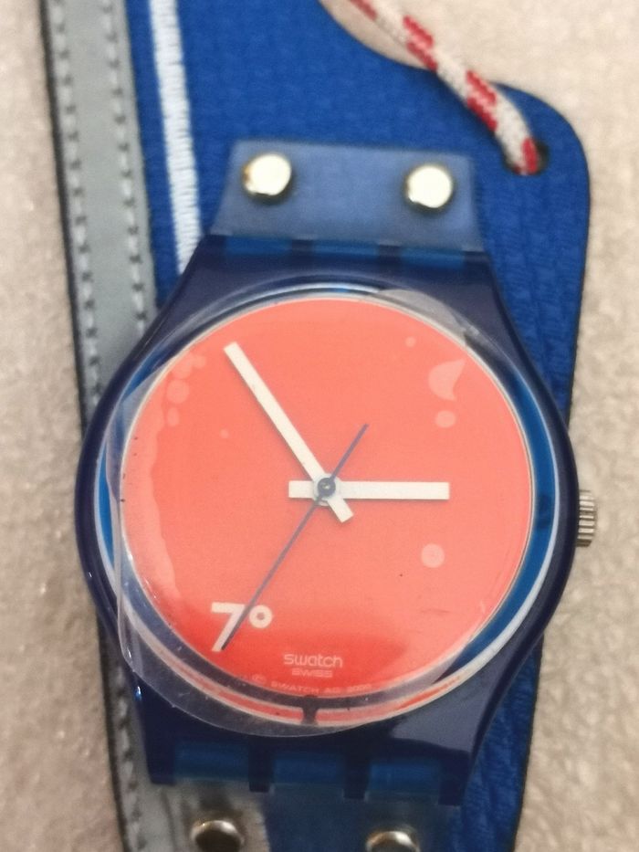 Montre SWATCH Collecteur Vintage "My Definition of", GN 200,Collection Gents 2001, boitier bleu de 34 mm à intérieur rouge, chiffre 7 à detail symbol de degrés, aiguilles blanches et trotteuse bleu, et bracelet textile bleu, gris et blanc, fermeture à boucle enclenché, neuve, encore avec la protection du verre, fonctionnante, pile fourni, prix définitif.