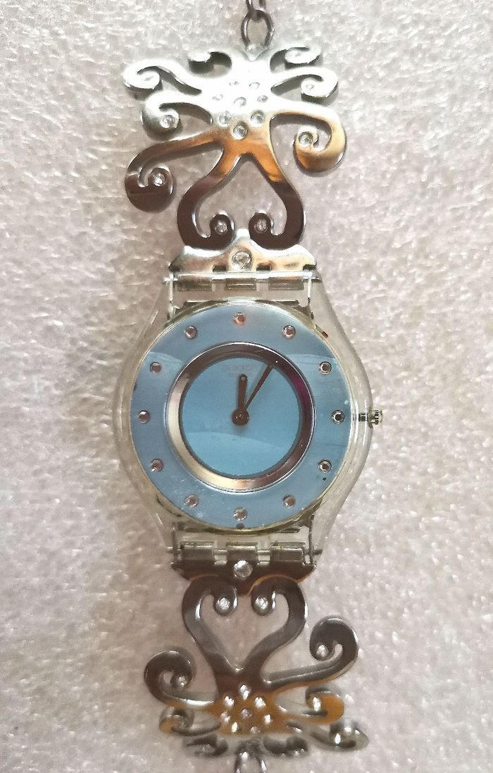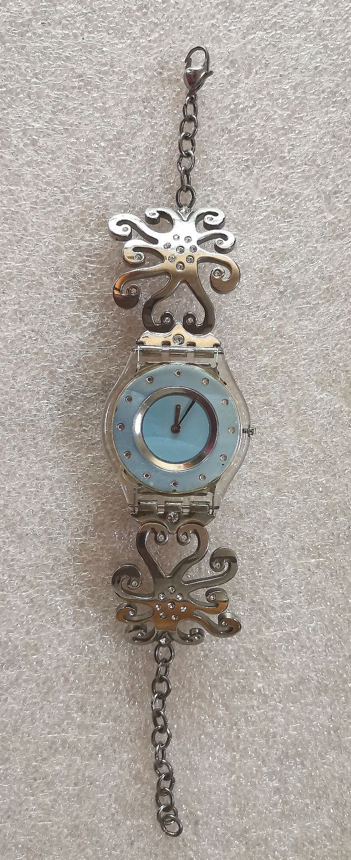 Montre SWATCH "Coralline Botany", SFK 293GPU, Specials Luxe Place Vendôme, Via della Spiga Milano, Collection Skin, Série Limité, boîtier ultra plat de 33,5 mm à intérieur bleu, contour orné de cristaux blancs brillants, aiguilles argent, et bracelet bijou fantaisie original orné de petits brillants, fermeture à chaînette réglable, en parfait état de fonctionnement, pile fourni, prix définitif.