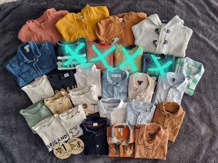 Lot de vêtements en très bon état général (1 chemise avec tache sur la manche, voir photo) comprenant: 5 gilets/veste 8 tee shirt manches longues 11 chemises fines et épaisses Taille 18 mois Marque diverses