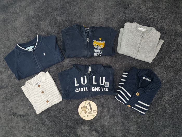 Lot de 5 gilet et 1 chemise en très bon état Possibilité de vendre au détail Marque diverses Taille 12 mois