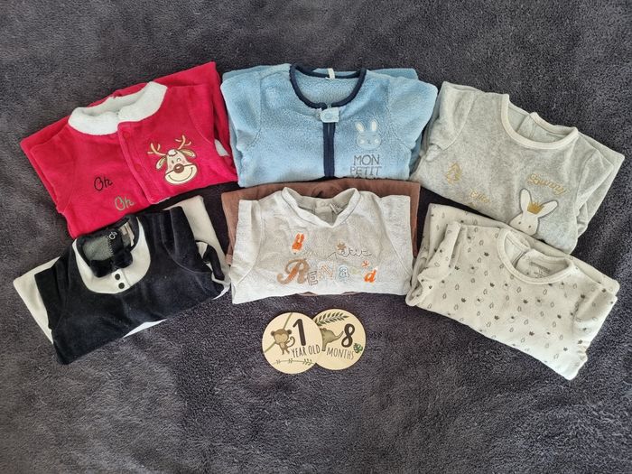 Lot de 6 pyjamas chauds en bon état. Le bleu présente un trou sous le bras (voir photo), le gris des petites tâches (voir photo) J'en donne 1 en plus qui as des bouton défectueux Taille 18 mois