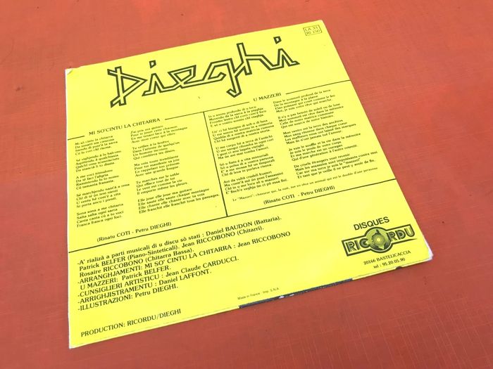 Vinyle 45 tours Dieghi Mi so' cintu la chitarra Ricordu LA 33 A J' étais un ange Ly rics By – Didier Barbelivien, Michel Delpech Music By – Claude Morgan 3:50 B J' étais un ange (Version Orchestre "Play Back") Music By – Claude Morgan 3:50