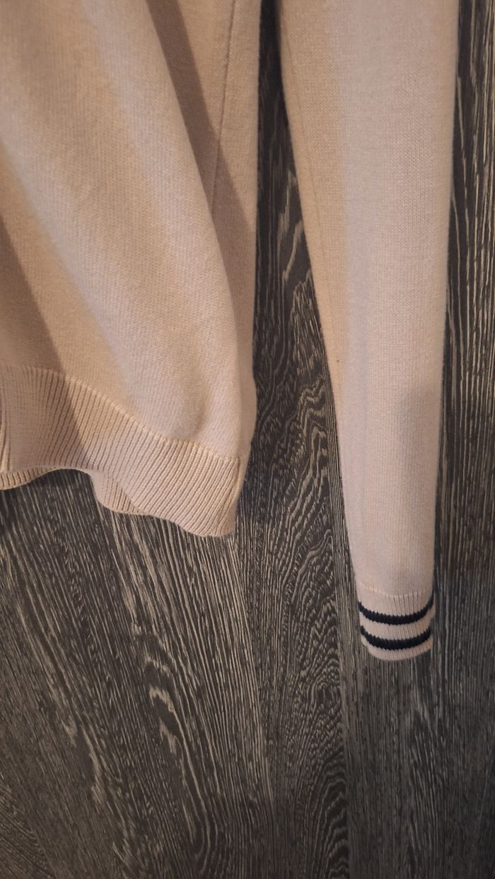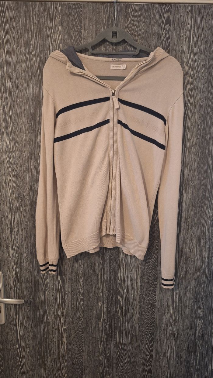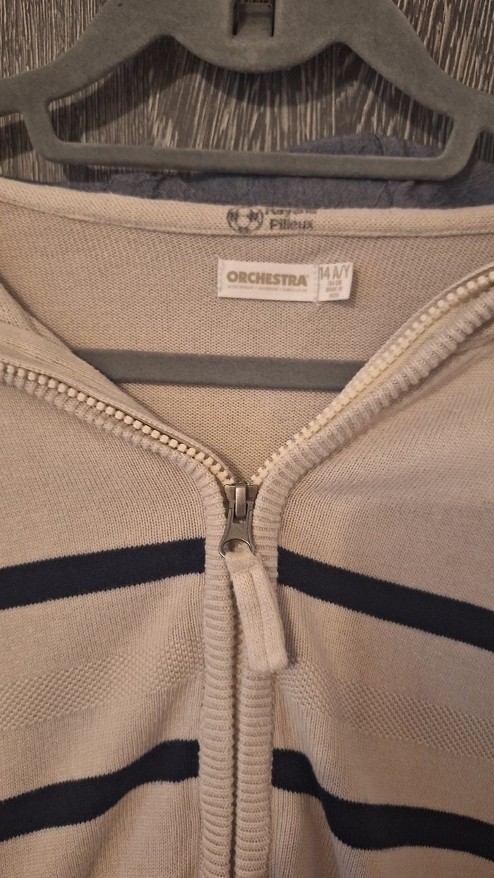 Bonjour ✴️Je vends ce gilet en parfait état ✴️De la marque Orchestra ✴️Taille 14ans ✴️100% coton ✴️Gilet en mailles fines ✴️Avec capuche et zip à fermeture éclair sur le devant ✴️Couleur bleu marine et blanc ainsi que gris intérieur capuche ⚠️Je vends le même gilet en beige