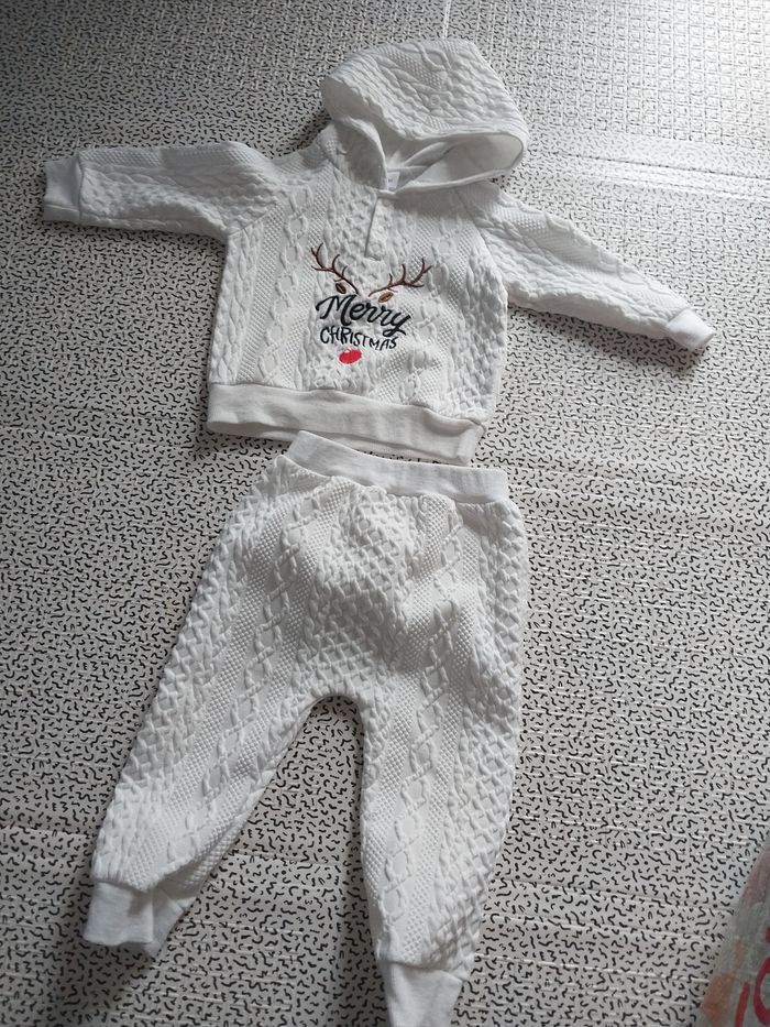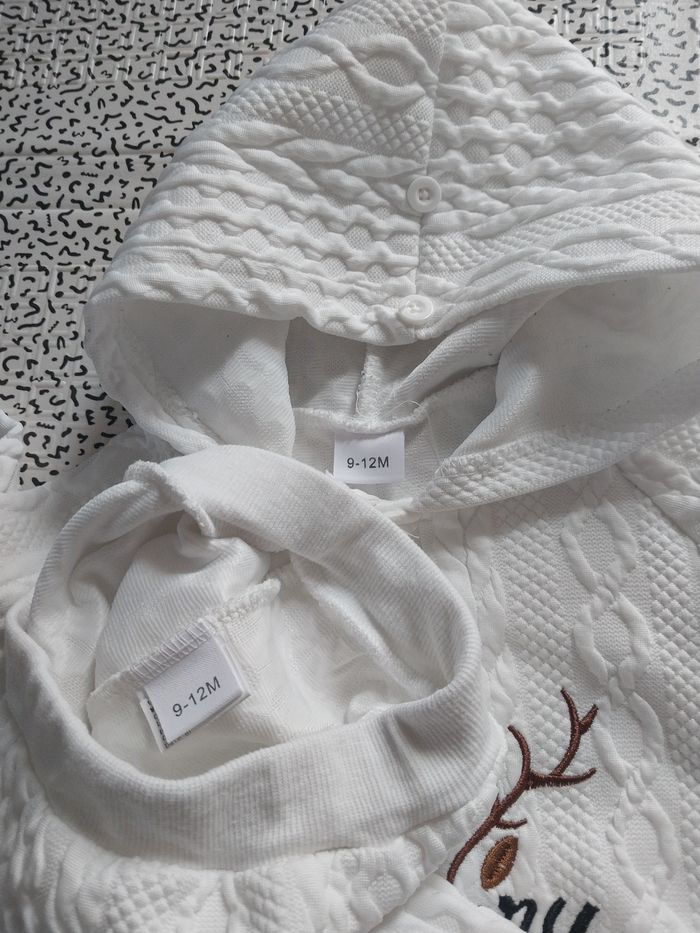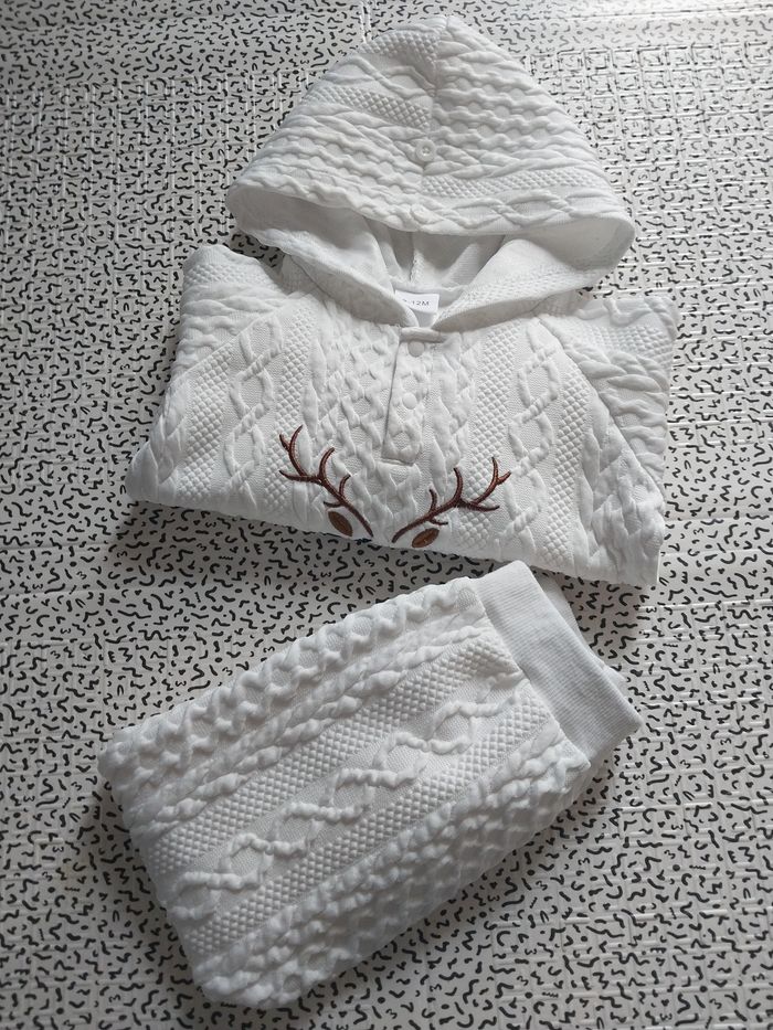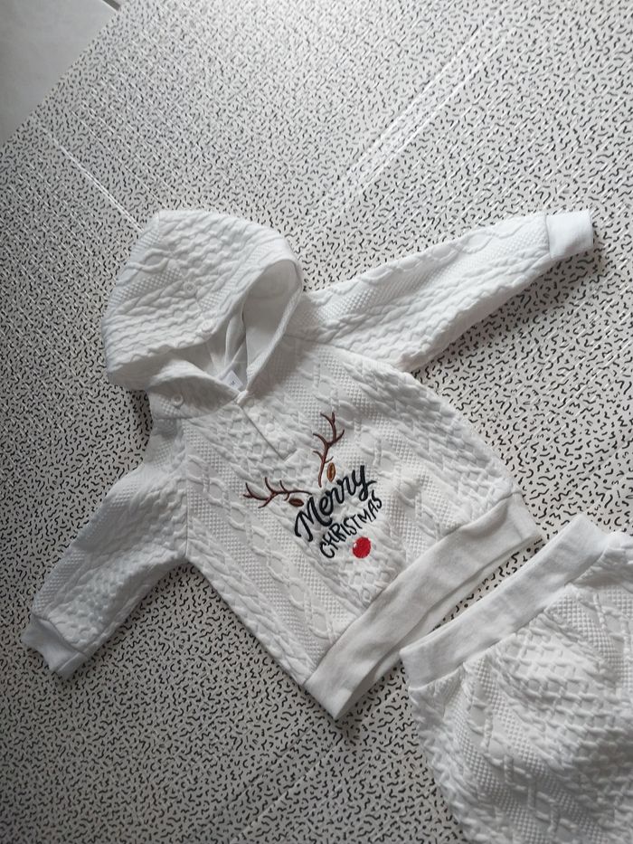 Trop mignon ensemble 2 pièces : sweat à capuche + pantalon assorti, motif renne brodé “Merry Christmas”. Coupe confort, matière épaisse façon maille torsadée, super pour les fêtes et les photos 🎄 Très bon état, peu porté. Set complet. Taille : 9-12 mois Couleur : blanc Saison : automne / hiver Idée : shooting de Noël, fêtes, tenue bébé, cadeau 📦 Envoi rapide & soigné #ensembleNoël #bébéNoël #merrychristmas #9mois #12mois