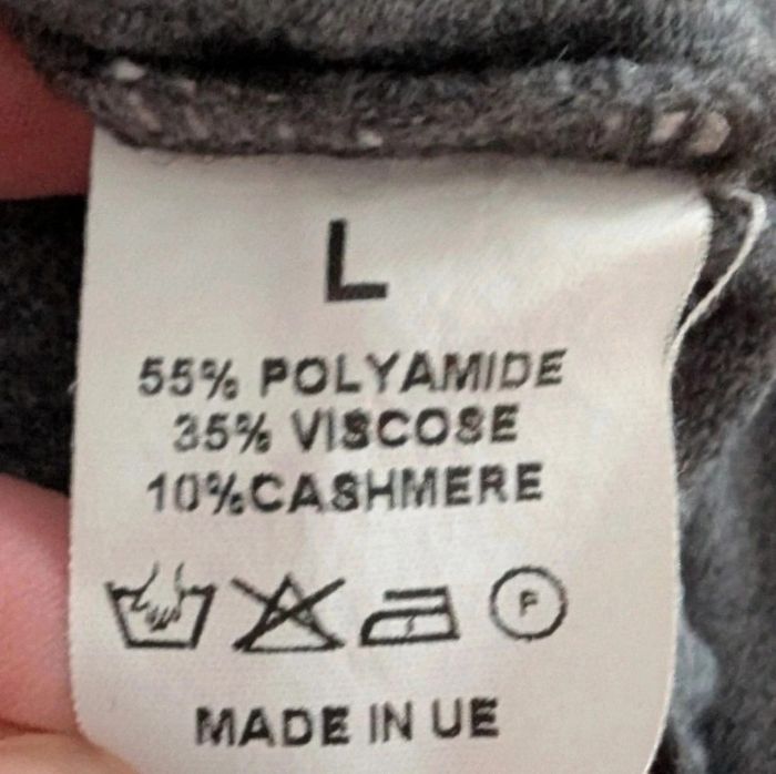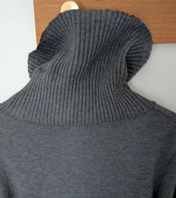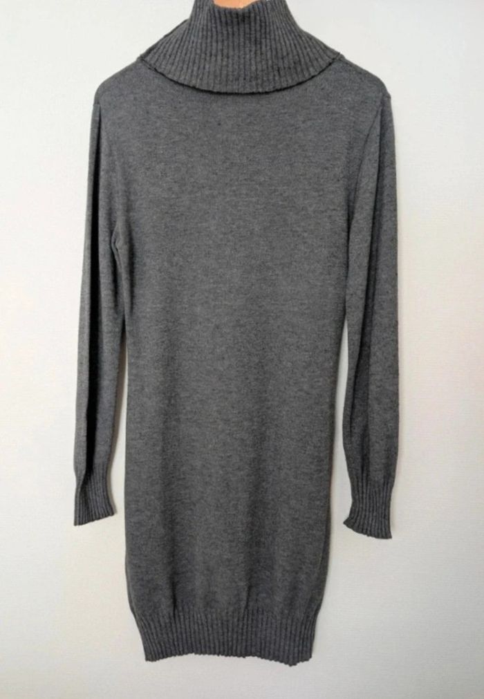 Robe pull à col cheminé et manches longues, couleur gris anthracite. Elle se porte près du corps. Matière très douce et confortable, ne gratte pas du tout. ⚠️ C'est indiqué taille L mais elle correspond plutôt à un M voir S (je fais du S/M et je la portais). Dimensions : largeur épaules 40 cm, longueur manches depuis aisselles 43 cm, longueur manches depuis épaules 62 cm, longueur totale 90 cm. Matière plutôt "stretch". Elle tient chaud (10 % de cachemire) et sera parfaite pour l'hiver avec des bottes, baskets ou cuissardes.