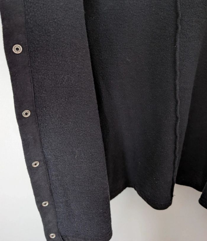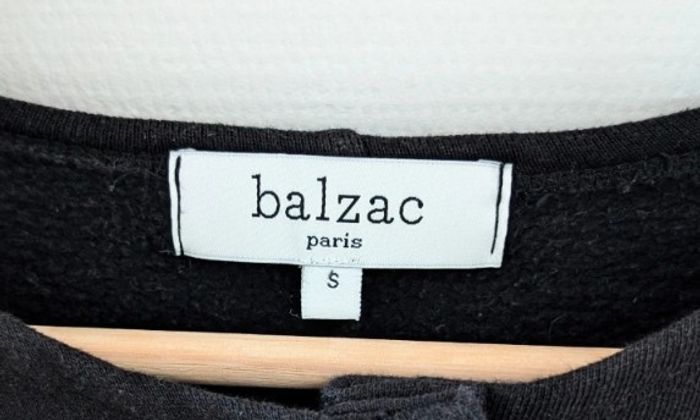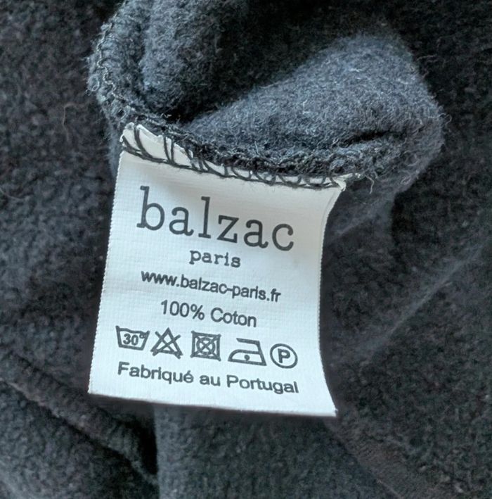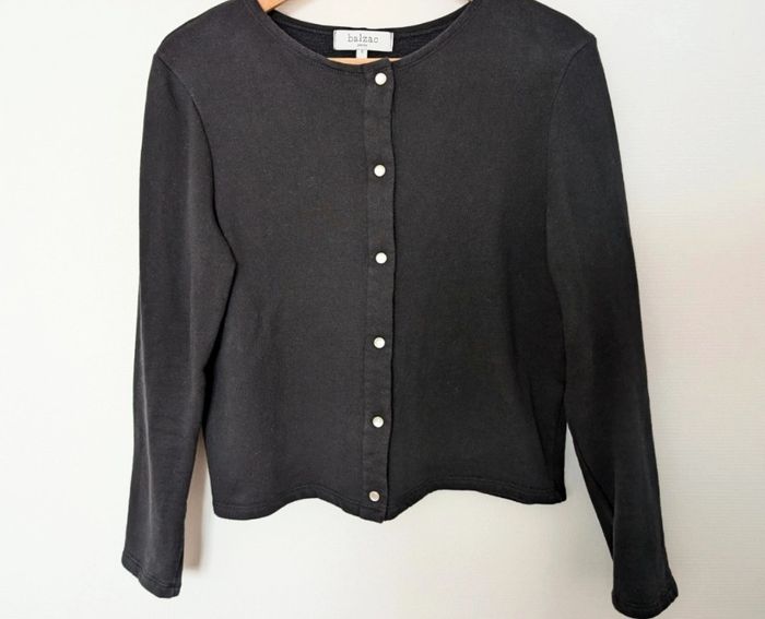 Cardigan noir à boutons pression blancs nacrés de chez Balzac Paris. 100 % coton, intérieur en matière polaire fine. Taille S mais petit S. Dimensions : longueur totale manches 58 cm, longueur manches depuis aisselles 39 cm, largeur aisselles à aisselles 51 cm, longueur totale gilet 52 cm.