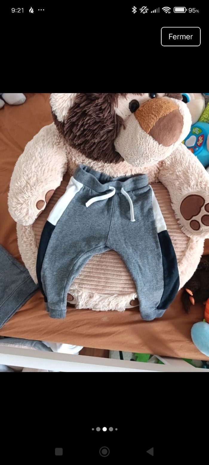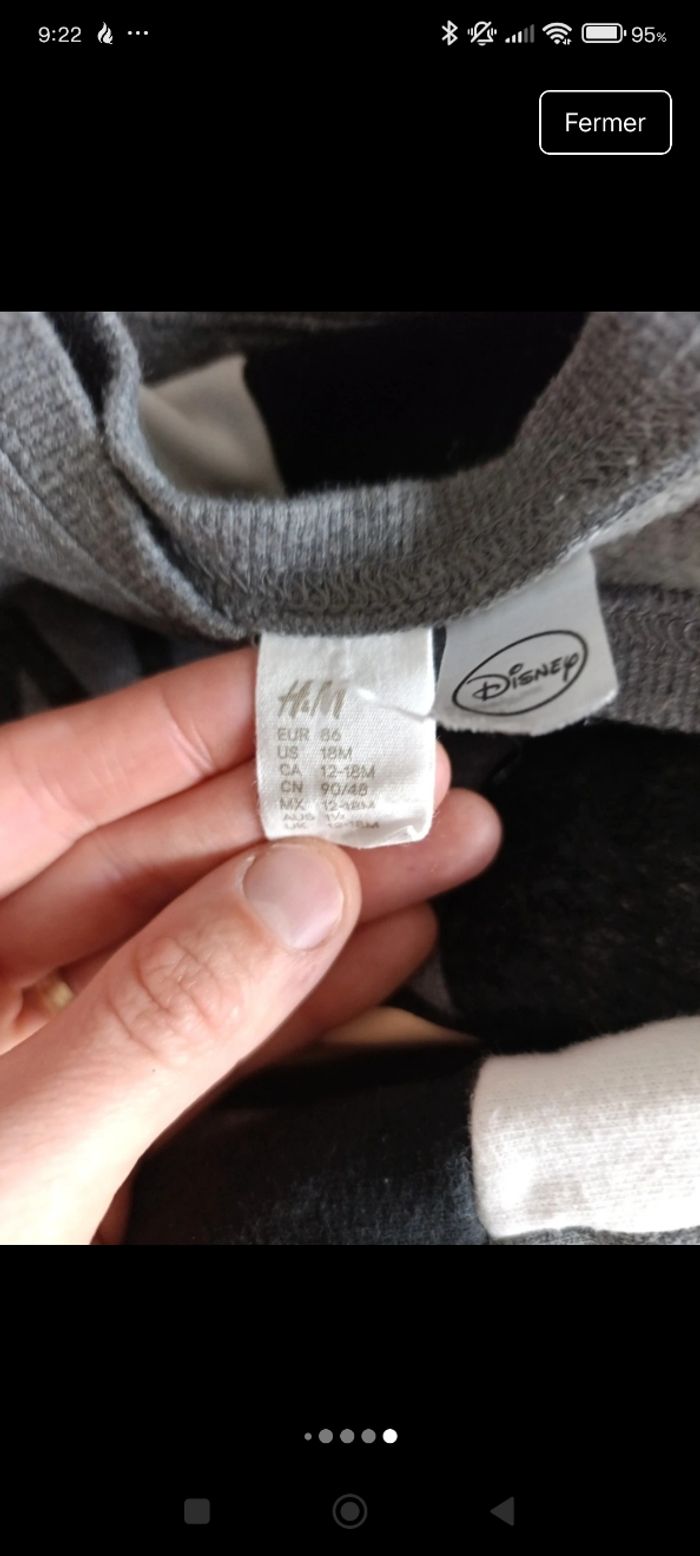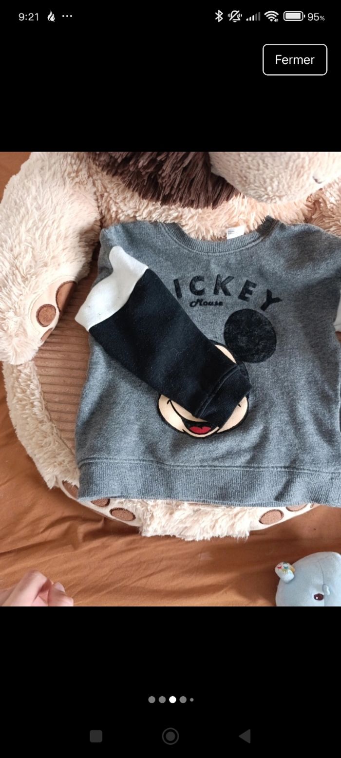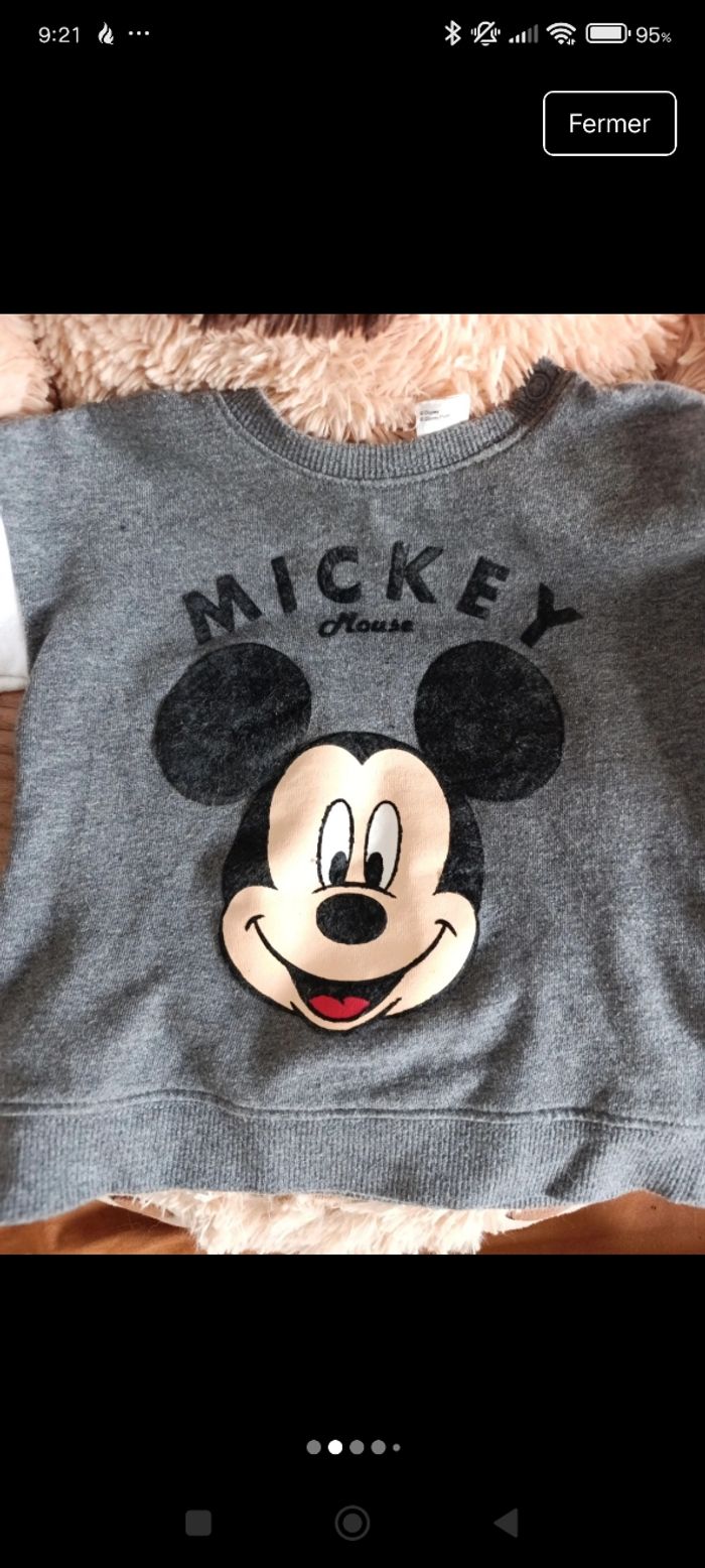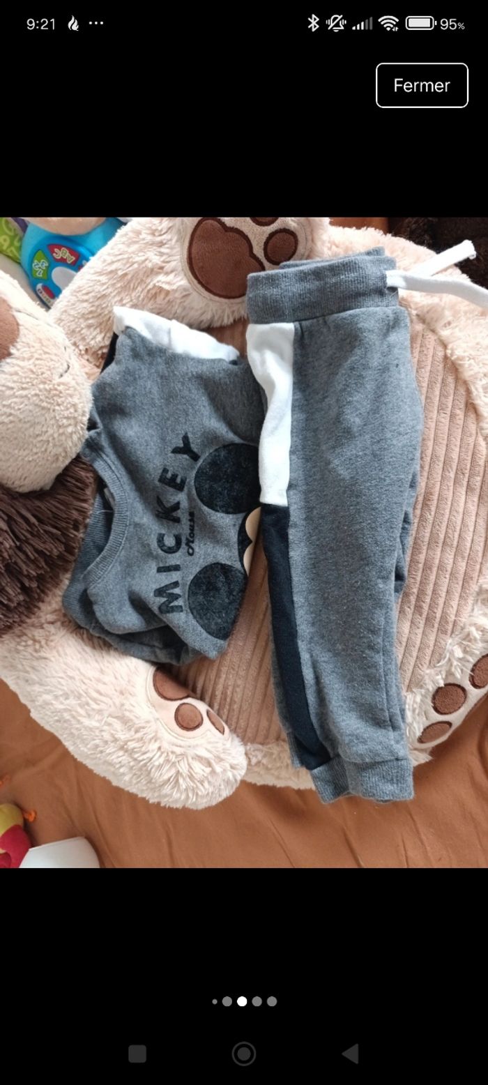 Un très beau survêtement il y a juste la tête de Mickey et Mickey n'a plus d'effacer mais ça ne gêne rien son état est impeccable. Taille 18 mois négociable