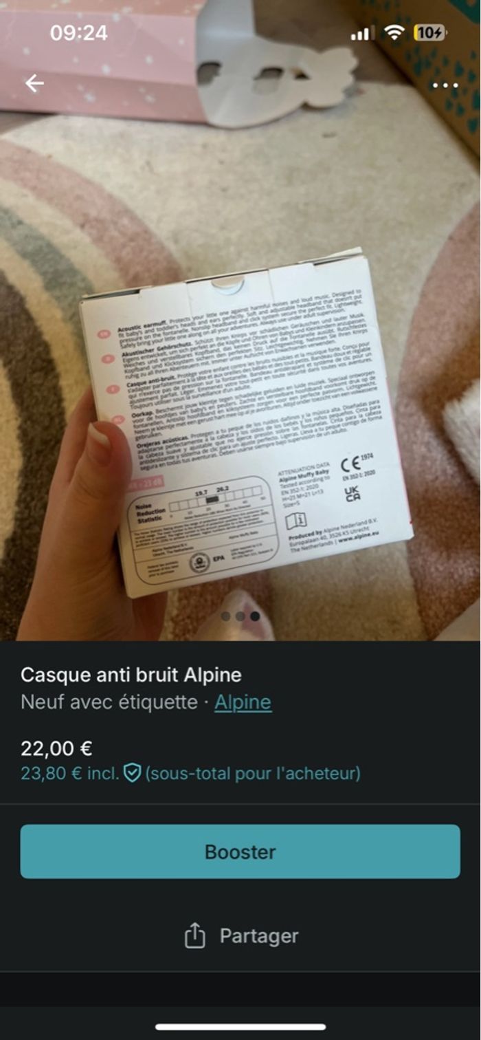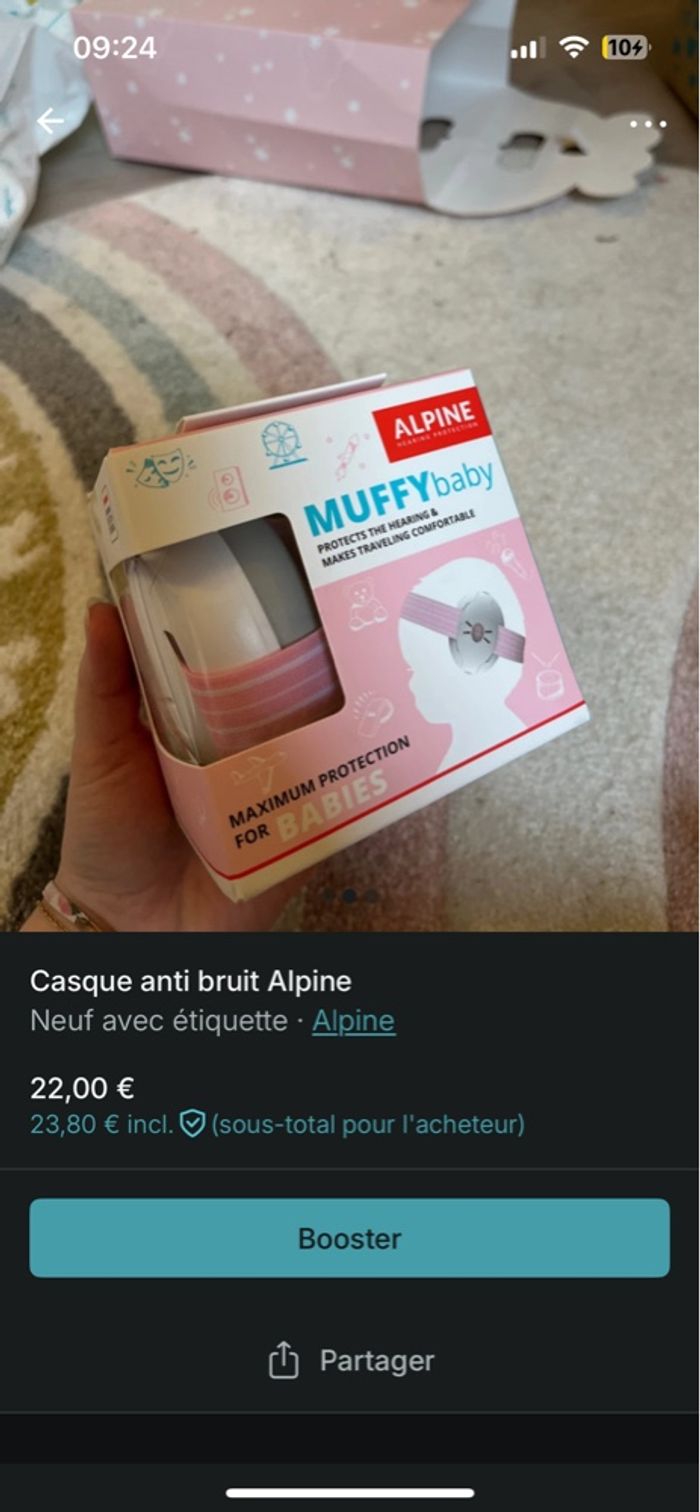 Casque antibruit de la marque alpine, NEUF jamais déballé, jamais utilisé. couleur rose . Prix achat : 30€ Prix re vente : 22€ Je vends celui que je m’étais acheté moi même . ( je l’ai également eu en cadeau ) —> je ne peux pas le renvoyer . De la naissance à 36 mois