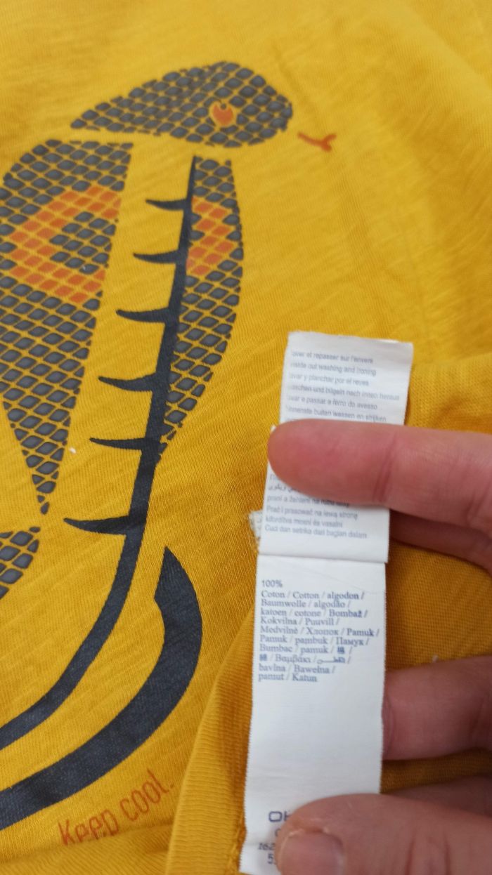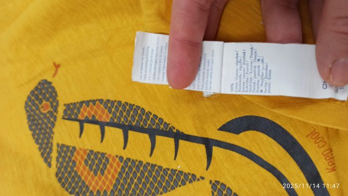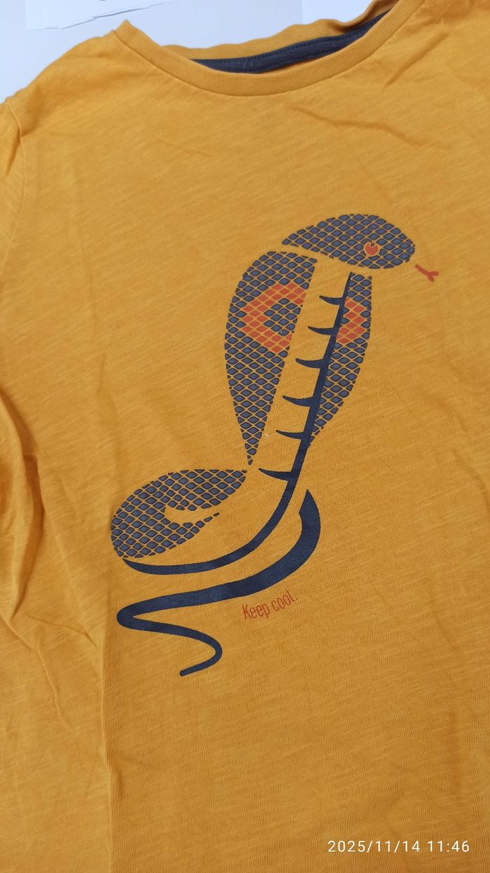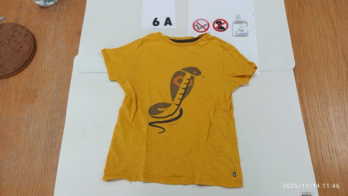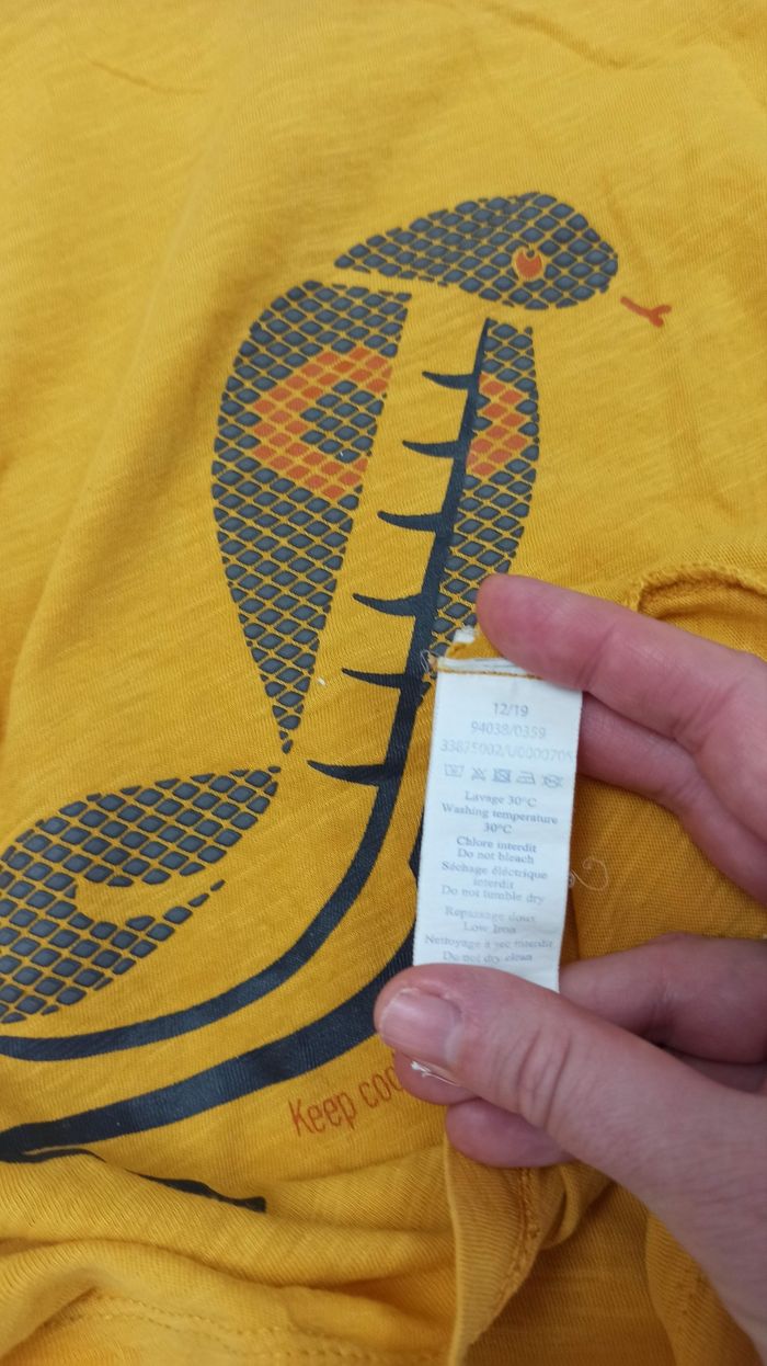 Expédition, priorité à : 1. shop to shop (depot du mardi au vendredi) et Colissimo 🚀. 2. mondial Relay et UPS (pas sur ma route quotidienne) 🏇.  3. Aucun Envoi par colis privé 🏴‍☠️.  Maison non fumeur Maison sans chats sans rongeurs sans N.A.C Stocké en compactor dans ma chambre.  Toujours exclusivement lavé avec des lessives saines ( je suis très vigilante au composition)  1 ère main = initialement acheté neuf T-shirt manches courtes animation Marque : okaidi Couleur : jaune moutarde Motif : serpent cobra en relief