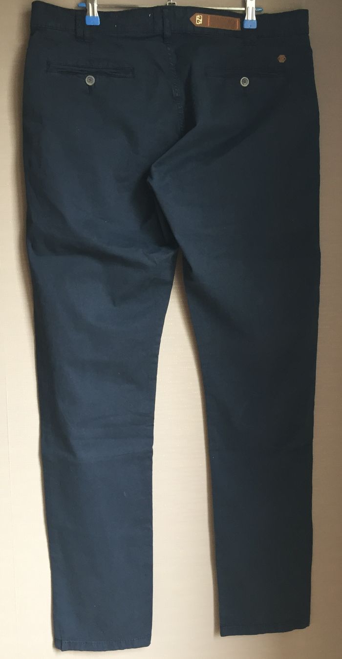 pantalon Chino toile de coton marine Taille W36 soit 46 longueur totale 112 cm, entrejambe 88 cm, largeur bas 18 cm largeur à plat au niveau de la taille 49 cm