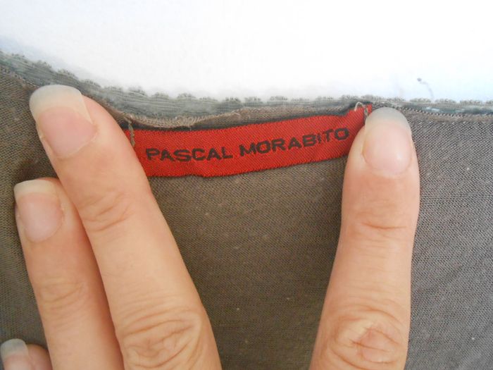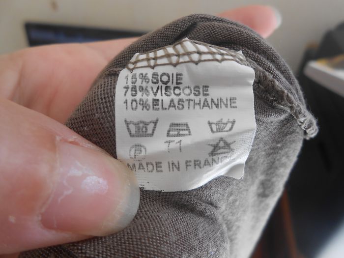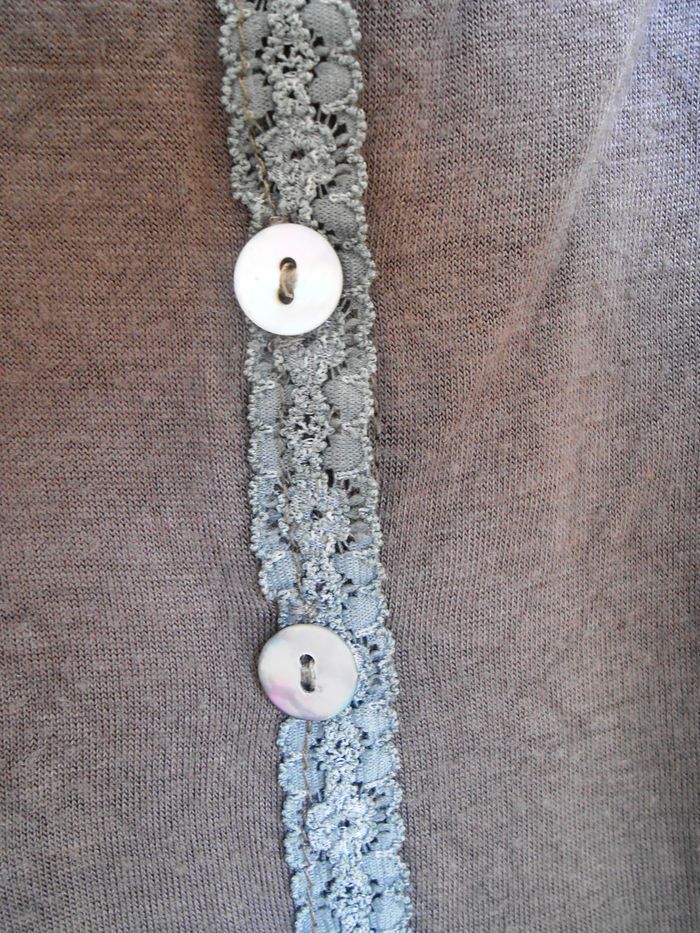 Très peu porté. Contient 15% de soie (voir étiquette en photo). Dentelle sur toute l'encolure + sur le devant où il y a les boutons. Très léger à porter.