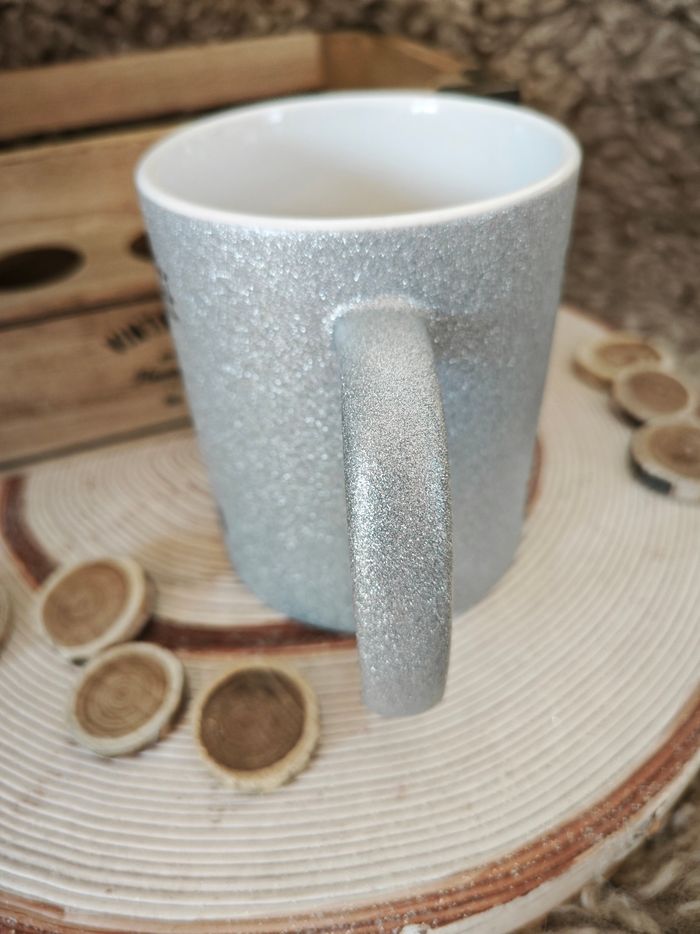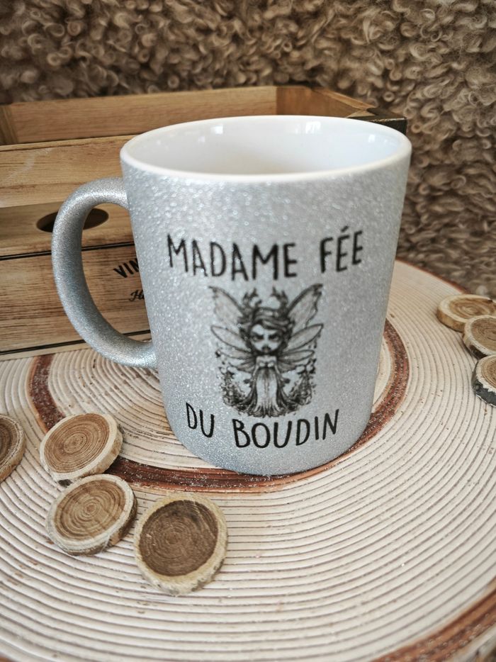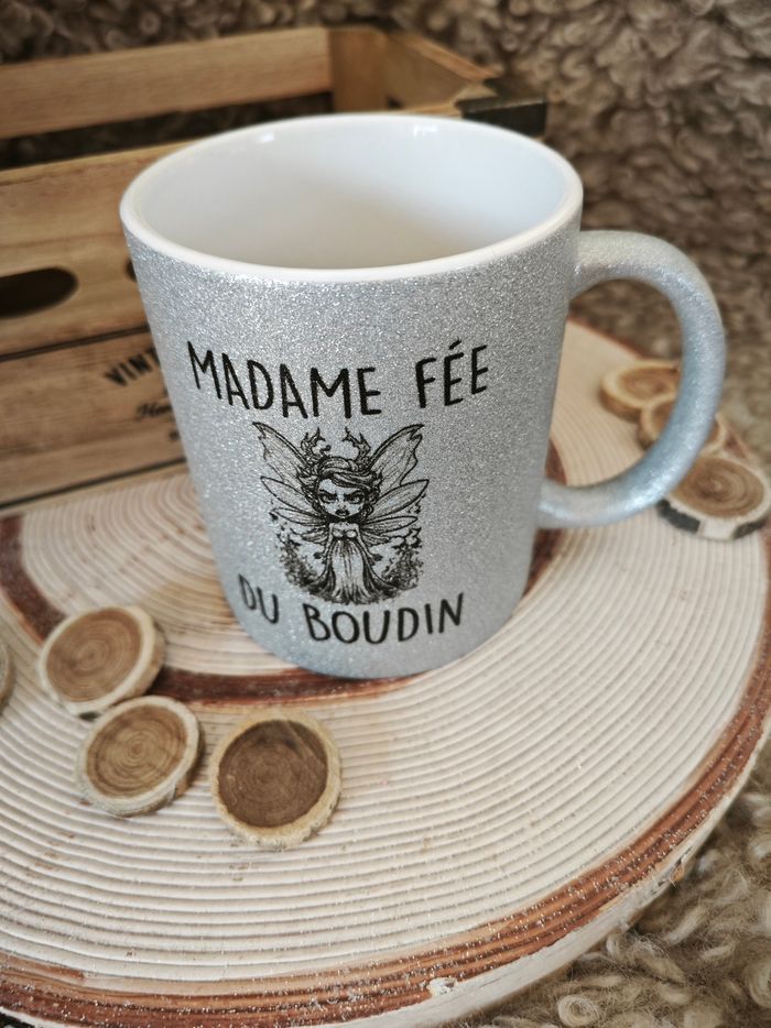 Tasse Mug en Céramique Glitter Argenté Paillettes Idée cadeau Madame Fée du Boudin Contenance 330 ml Jamais utilisée Neuf ⛔⚠️ Ne Convient pour lave-vaisselle et micro-ondes