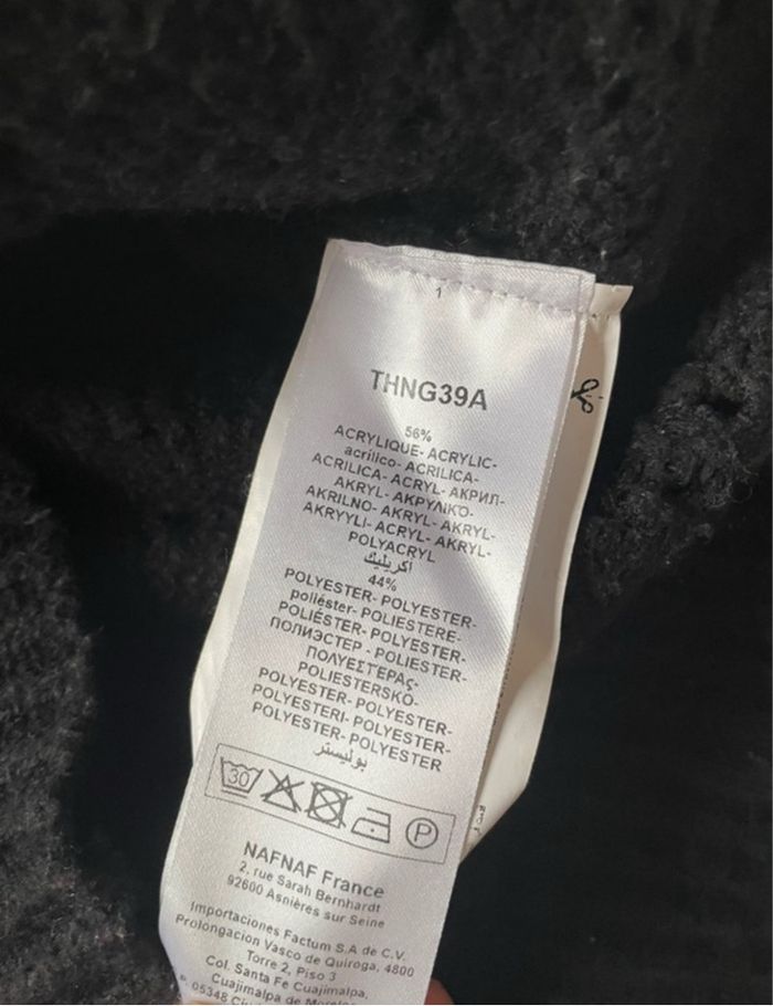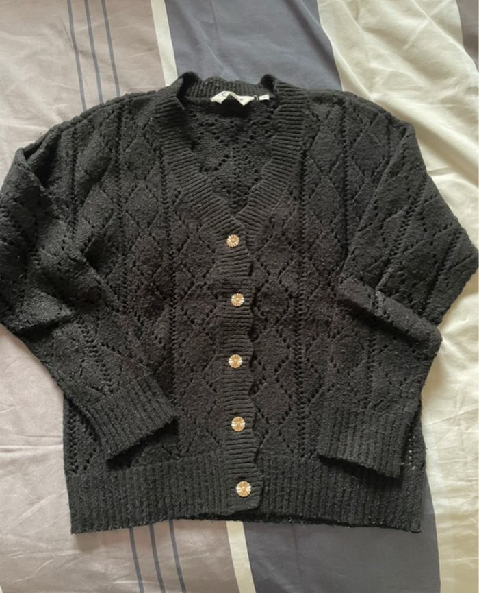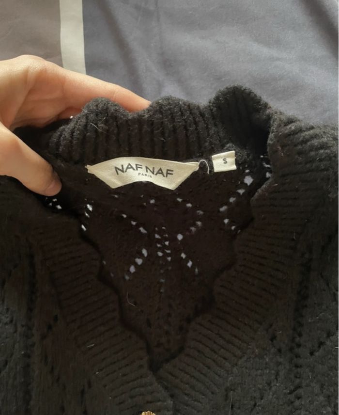 Joli cardigan noir Naf Naf taille S. Les boutons dorés sont en forme de marguerites. Le pull/gilet/cardigan est bouloché mais n’a pas d’autre défaut. Acheté 50€ en boutique Naf Naf.