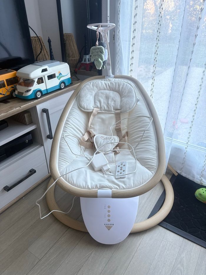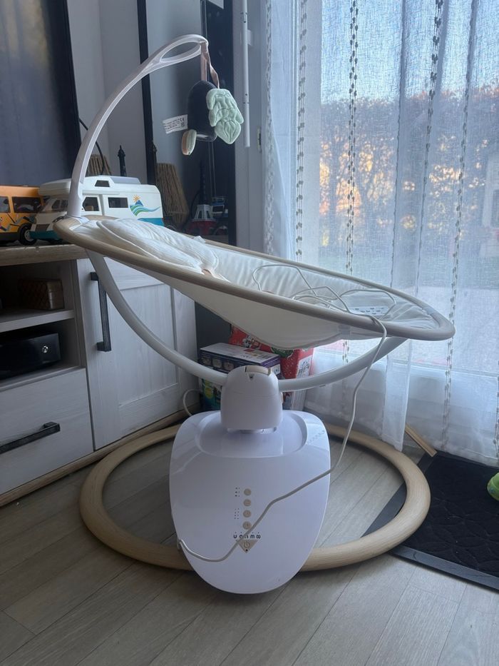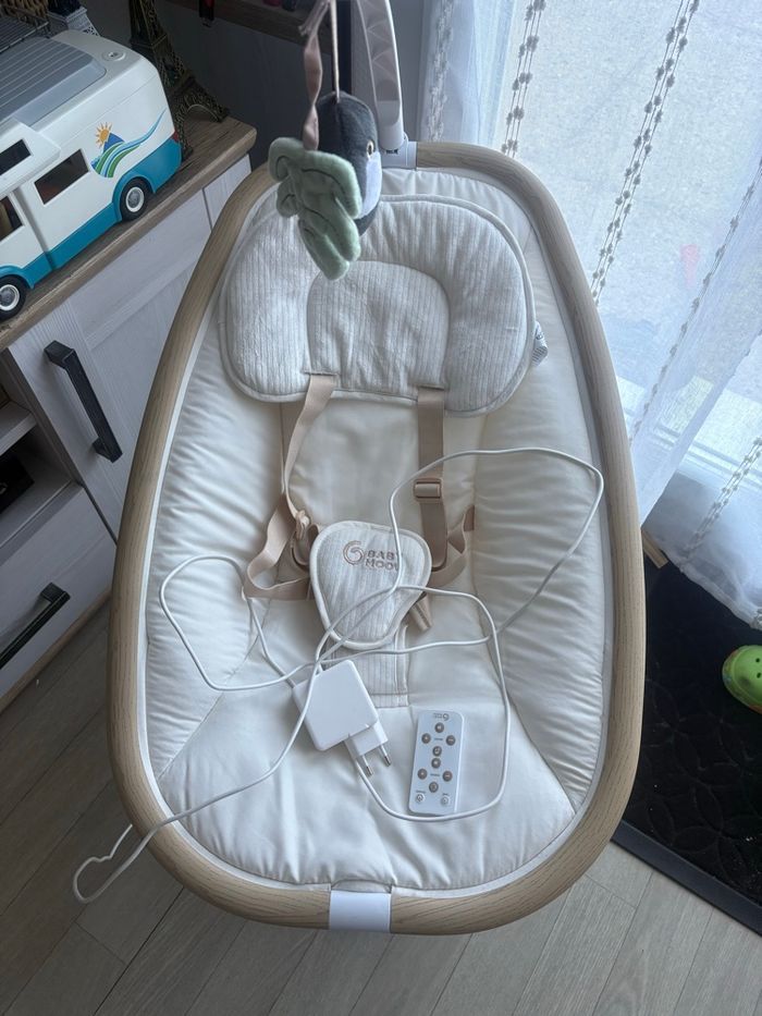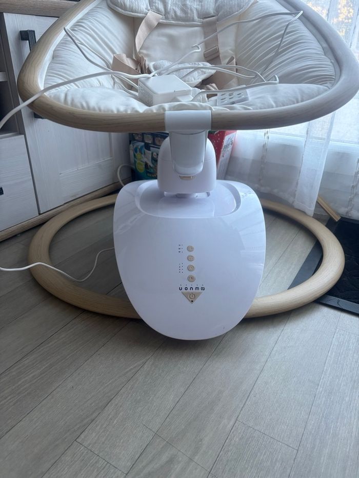 Vends balancelle babymoov modèle swoon hoop, différents bercements et 4 vitesses. Très bon état juste deux petites taches sur l’assise mais l’assise est lavable (je n’ai pas eu le temps) et la fonction musique ne fonctionne plus. Vendu avec la télécommande