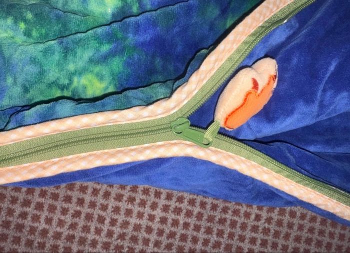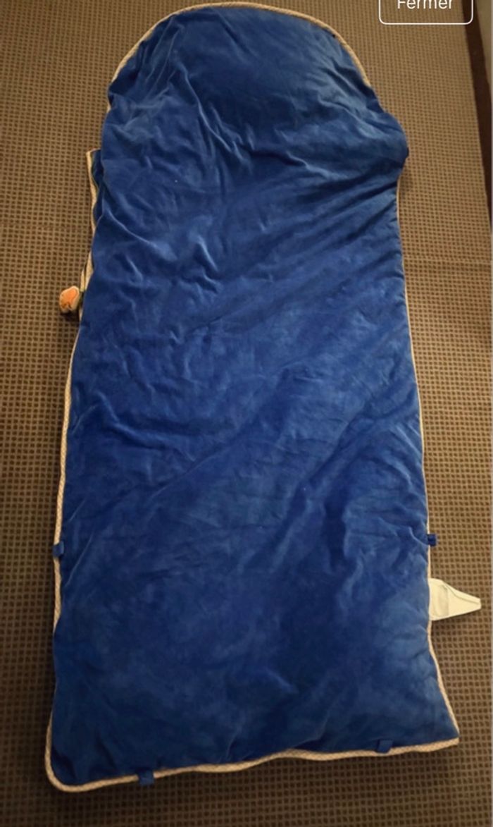 Très bon état - peu utilisé Touché peluche tout doux Fermeture par zip Tête rembourrée qui sert de coussin Largeur 70cm environ Longueur du couchage SANS la tête 121 cm environ Longueur des pieds jusqu'au sommet de la tête 168cm environ Possibilité de raccourcir la longueur avec un système de scratch